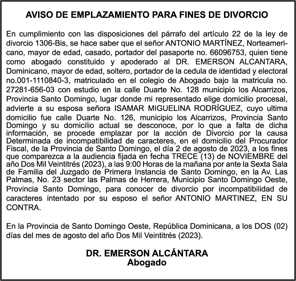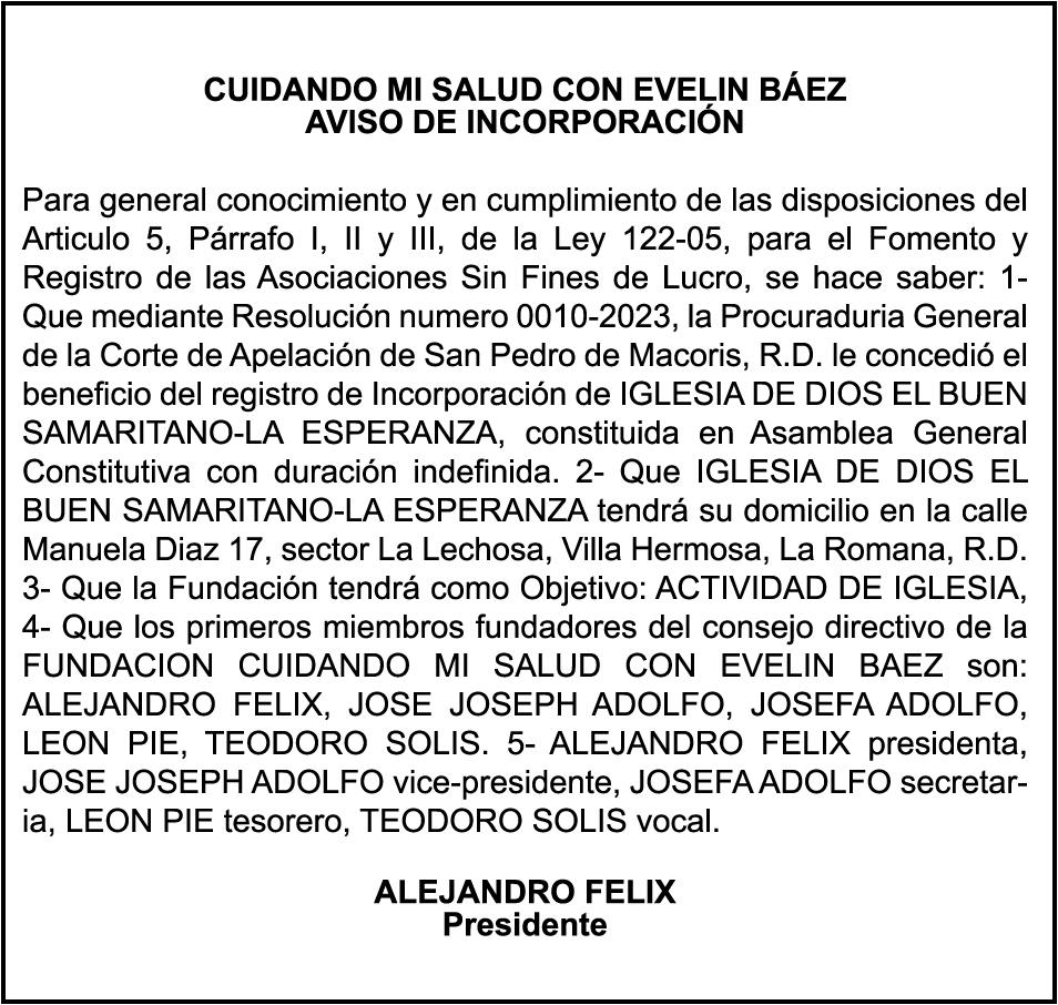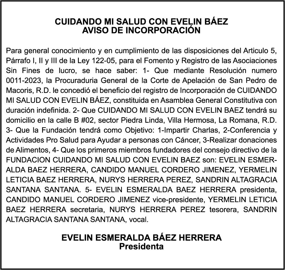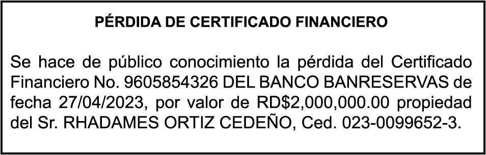 PERDIDA DE CERTIFICADO FINANCIERO se hace de público conocimiento que se ha extraviado el Certificado Financiero No. 236FCDC921DEE961117A6BD40BB1AB217240EE, emitido por Asociación Popular De Ahorros Y Préstamos, en fecha 17/08/2018, por el monto de RD$200,000,00. a nombre de NARCISO REYNOSO PASCUAL Y BRIGIDA CABRERA VALLEJO, Ced. 002-0044512-0 Y 08200096215.