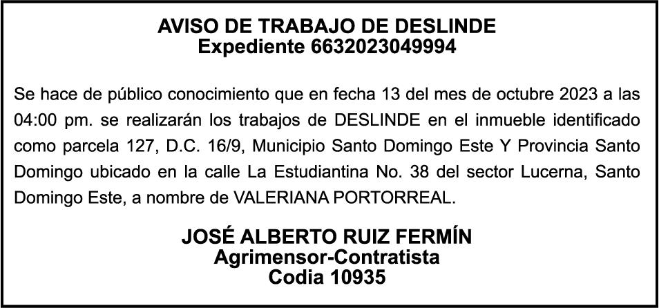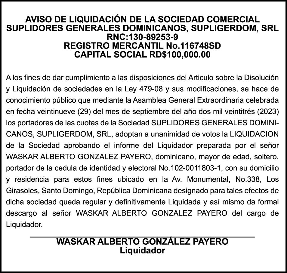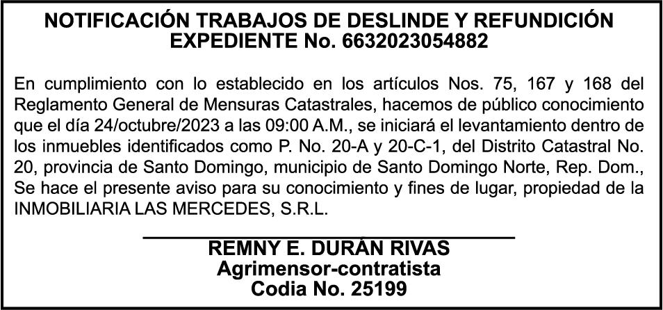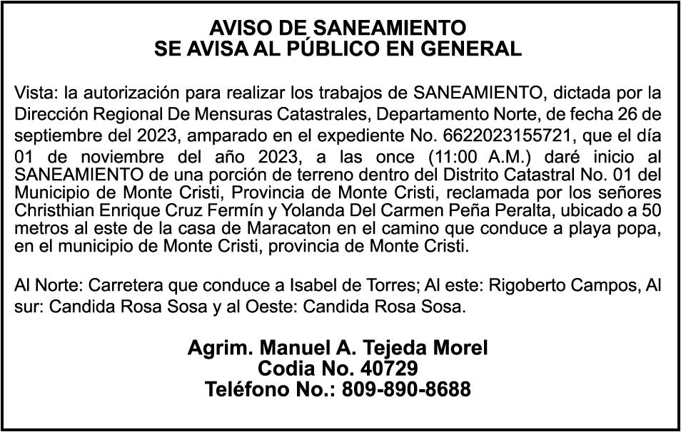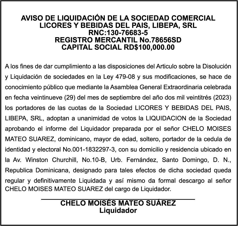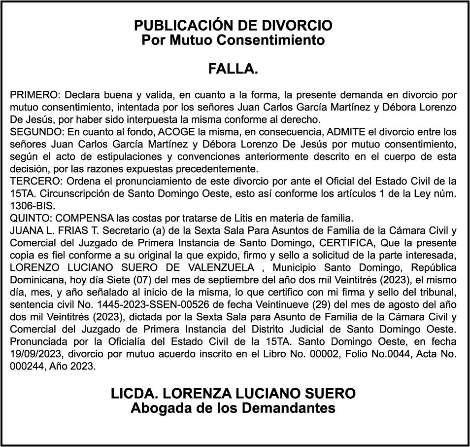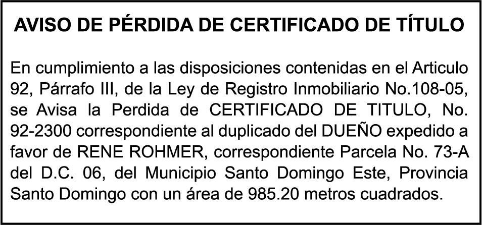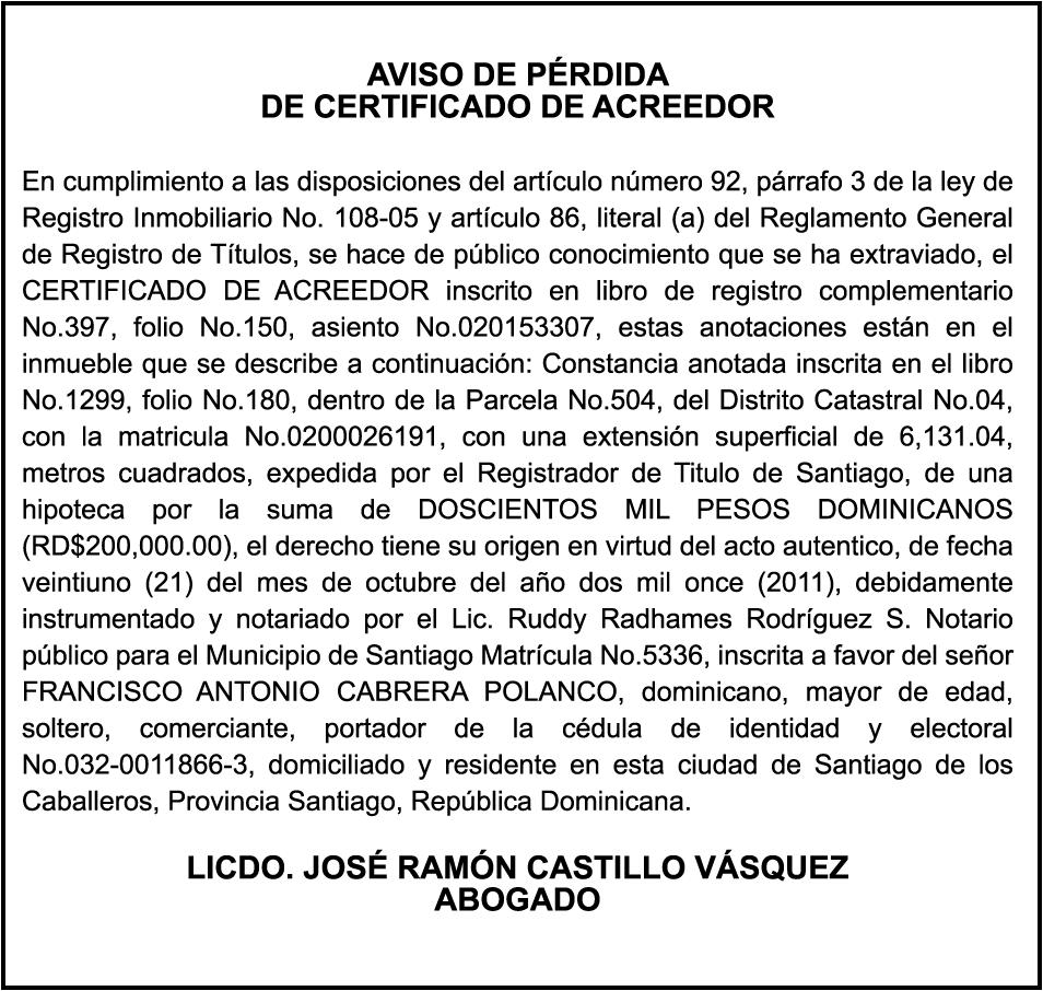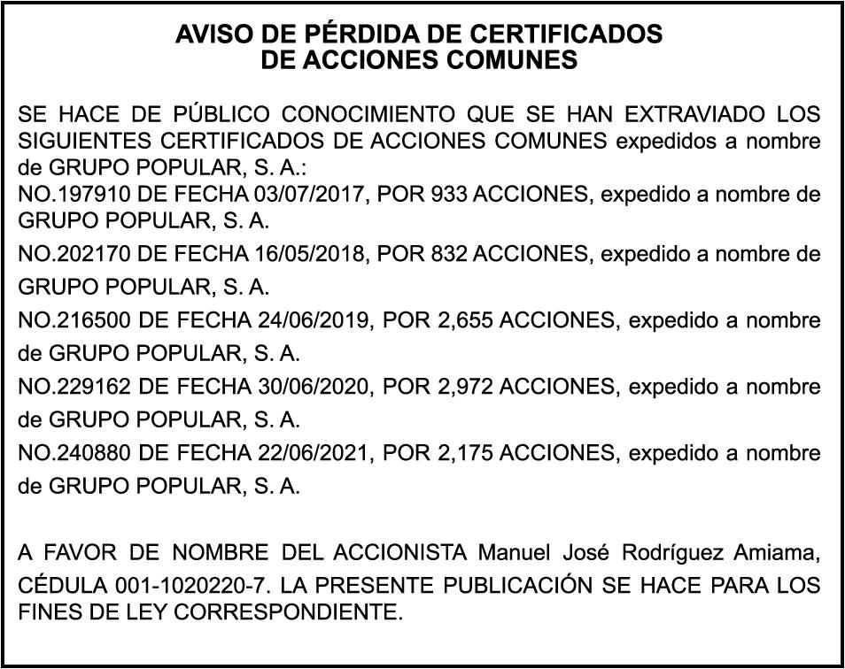 SE HACE de público conocimiento la pérdida de certificado de depósito número 827814757 emitido por Banco Popular Dominicano, S. A., a favor de FABIO LUIS GARCIA GUERRA Cedula de identidad y Electoral número 001-03753232, expedido en fecha 20 de mayo de 2022 por el monto de (US$10,040.23), más intereses generados a la fecha.