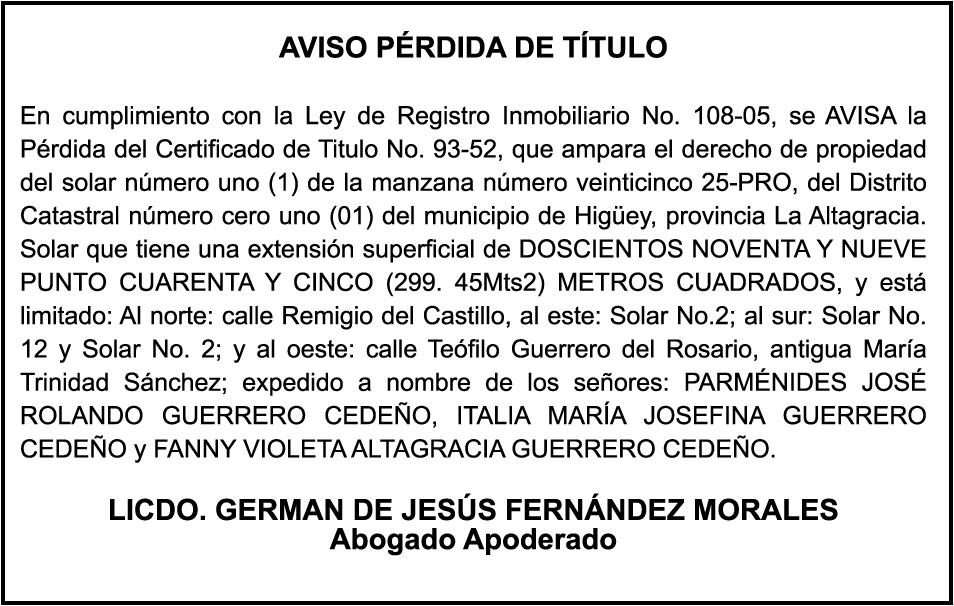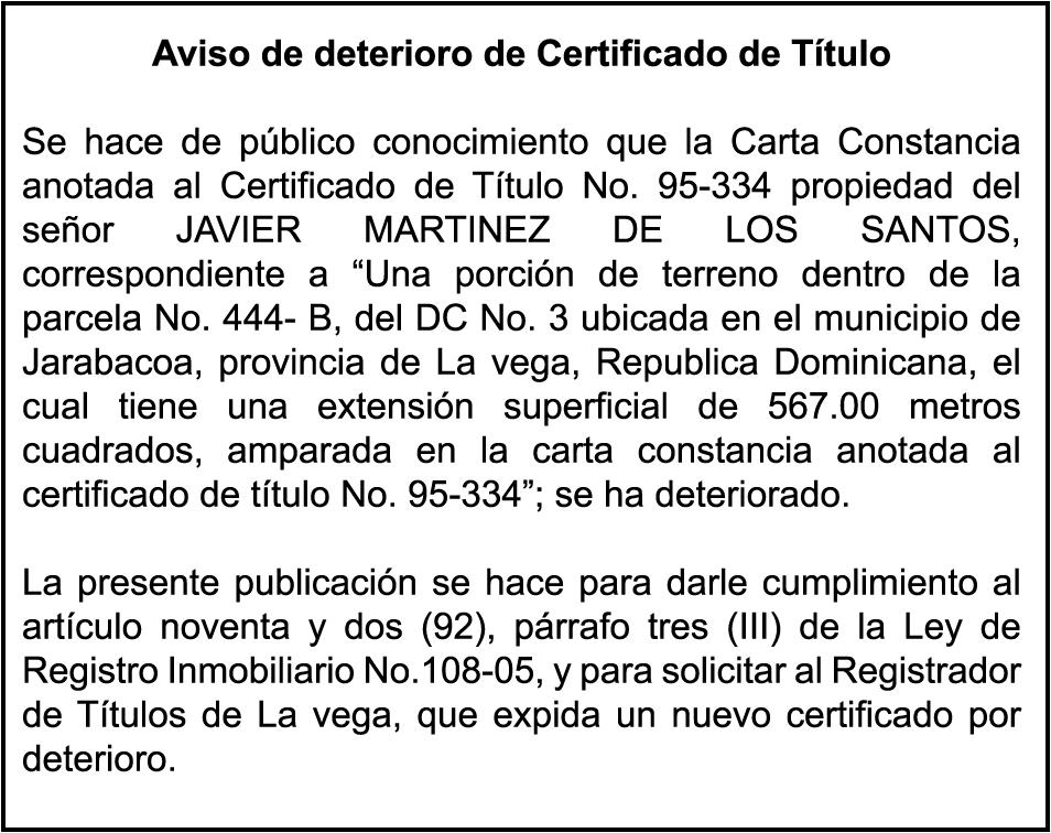 PERDIDA Certificado de Titulo, identificada con la matricula NO. 3001022532, dentro de la parcela 426, del D.C. No. 10.6, de Higüey, con una extensión superficial (140.00 mts2) a nombre de JOSE CARPIO CEDEÑO.