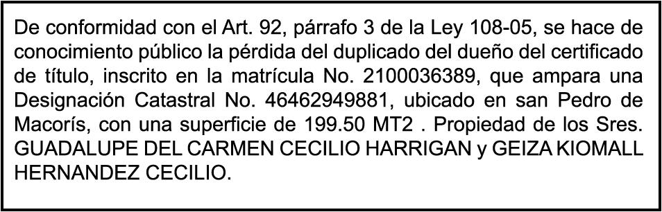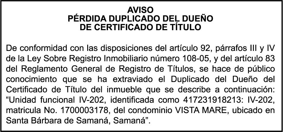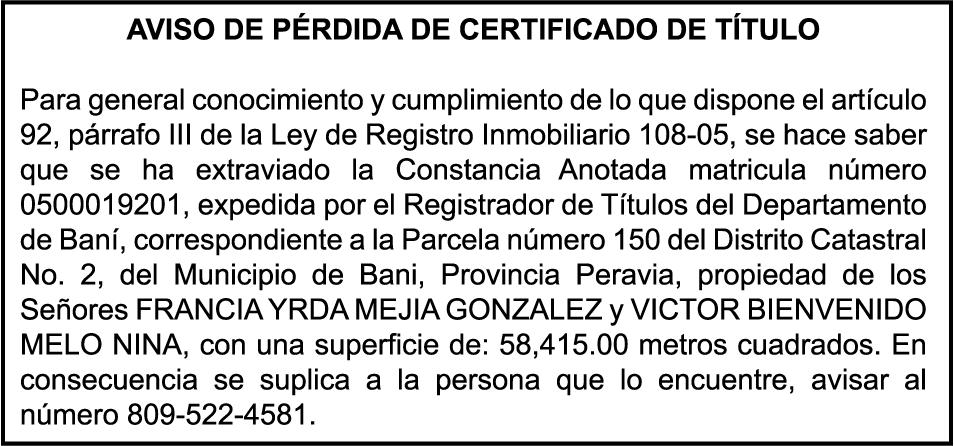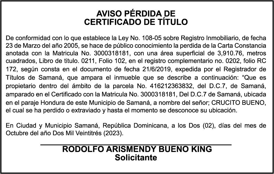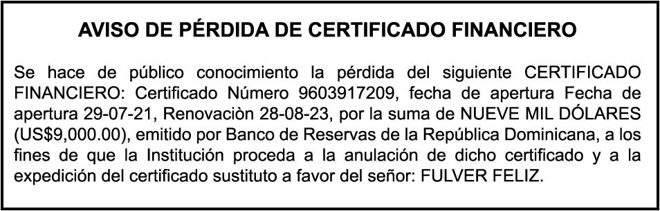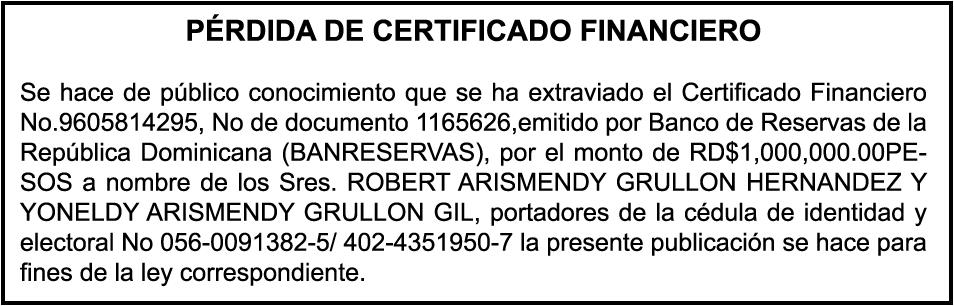 RODRIGUEZ SANCHEZ SE hace de público conocimiento la pérdida de certificado financiero número 809445711 emitido por Banco Popular Dominicano, S. A., a favor de ALONDRA