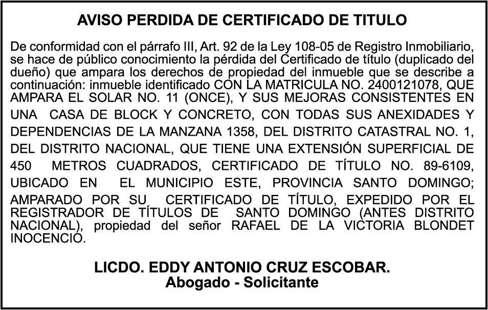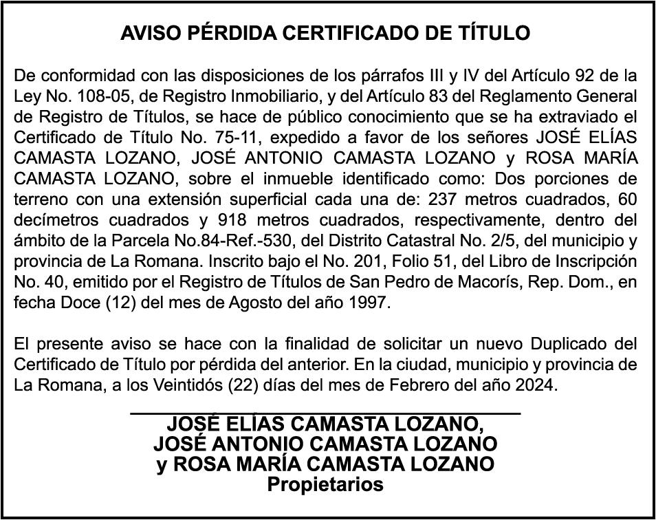FINANCIERO Se hace de público conocimiento la pérdida del Certificado financiero No. 1744062, emitido por el BANCO