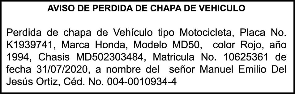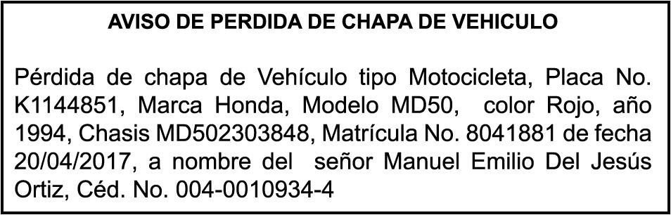 PERDIDA DE PLACA No. N902514, Motocicleta