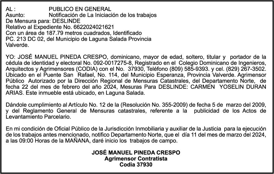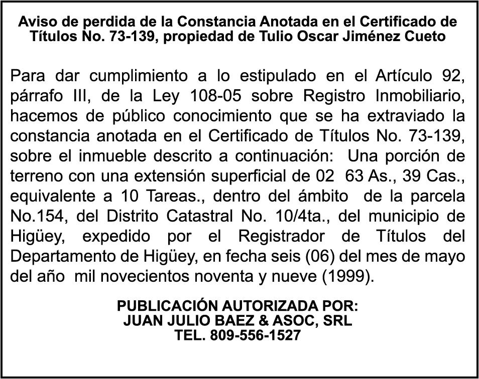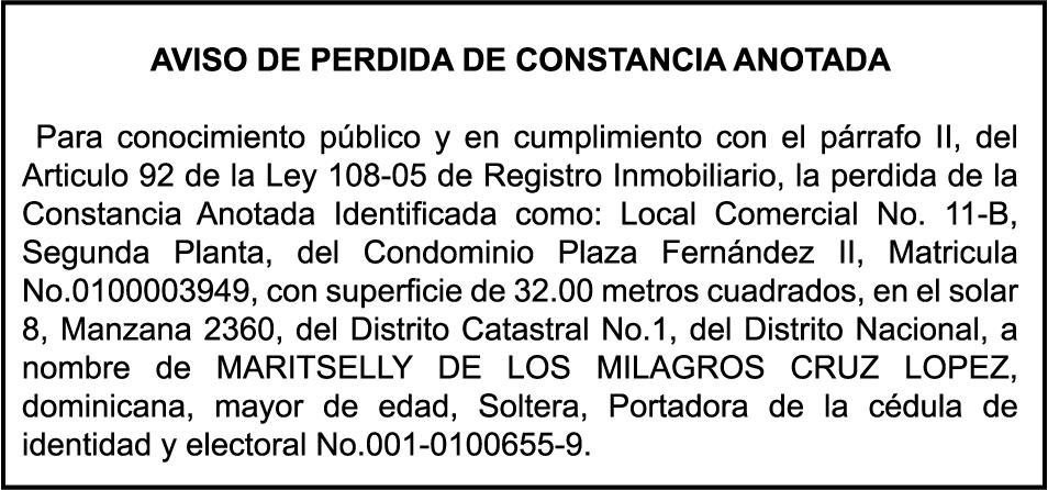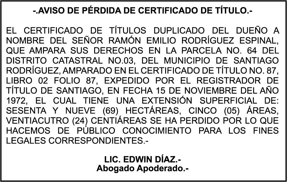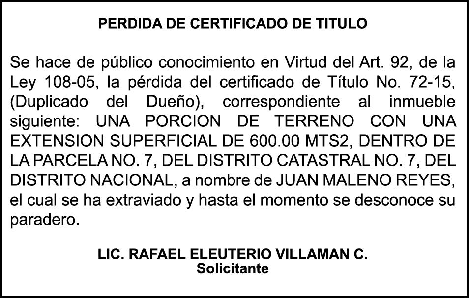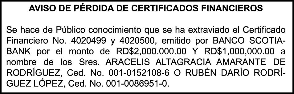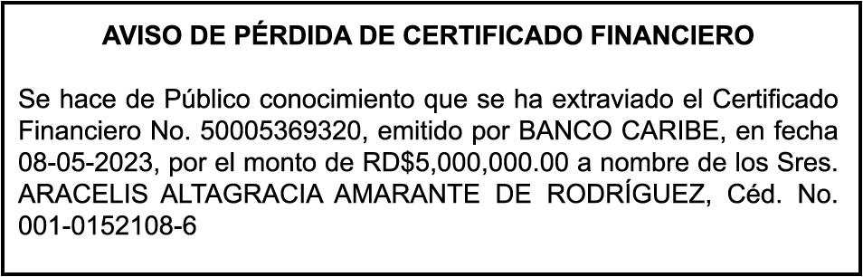 SE hace de público conocimiento la pérdida de certificado de depósito número 835066127 emitido por Banco Popular Dominicano, S. A., a favor de JUAN ANTONIO