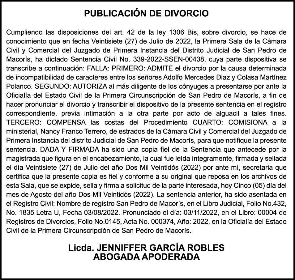 Motocicleta HONDA, Modelo SUPER CUB 90, Color VERDE, Año 1984, Placa K-0053193, Chasis HA02210461, a nombre de ARGELYS RAFEL PERALTA MERCEDES. SE hace de público conocimiento la pérdida de certificado de depósito número 823308978 emitido por Banco Popular Dominicano, S. A., a favor de CLAUDIA AIMEE JAVIER RAMIREZ, 223-0105686-1, certificado expedido en fecha 4 de agosto de 2021Por el Monto (RD$147,340.00), más intereses generados a la fecha.