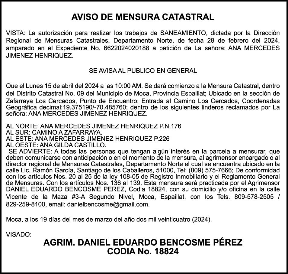 SE hace de público conocimiento la pérdida de certificado de depósito número 817694235 emitido por Banco Popular Dominicano, S. A., a favor de DANIELA PEREZ SANCHEZ, portadora de la cedula de identidad y electoral no. 4022829949-7, certificado expedido en fecha 5 de marzo de 2020 Por un Monto de (RD$66,893.36), más intereses generados a la fecha.