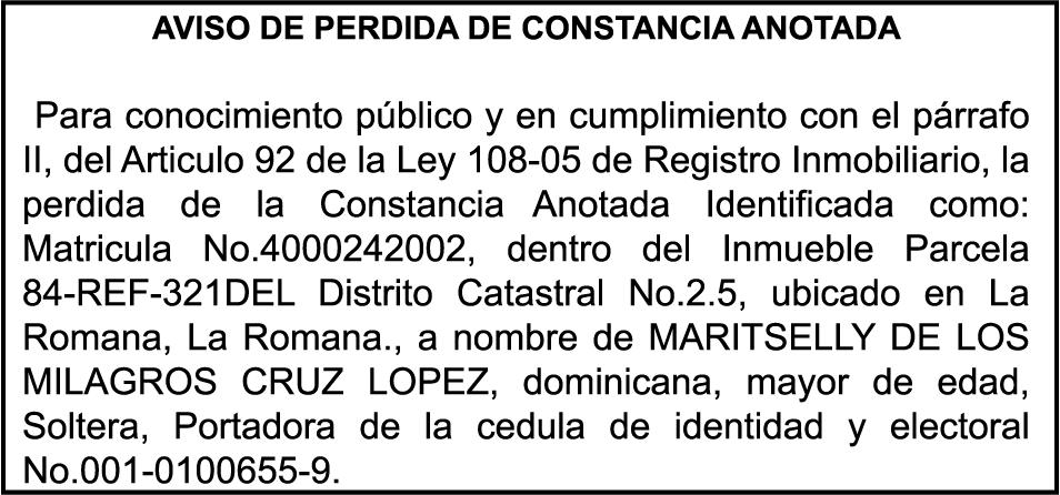 PERDIDA DE PLACA No. L382449, Veh. Carga Isuzu, modelo NPR, color blanco, año 2006, chasis JALC4B16667008571, a nombre de ANEYSI RUBIO MARTINEZ, Ced. 229-0000668-9.