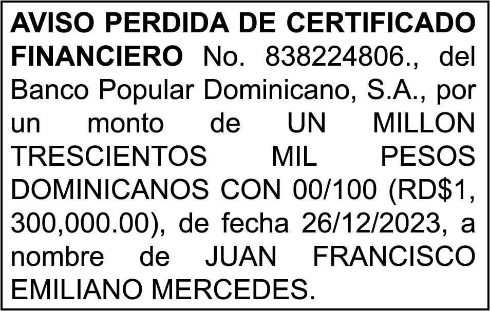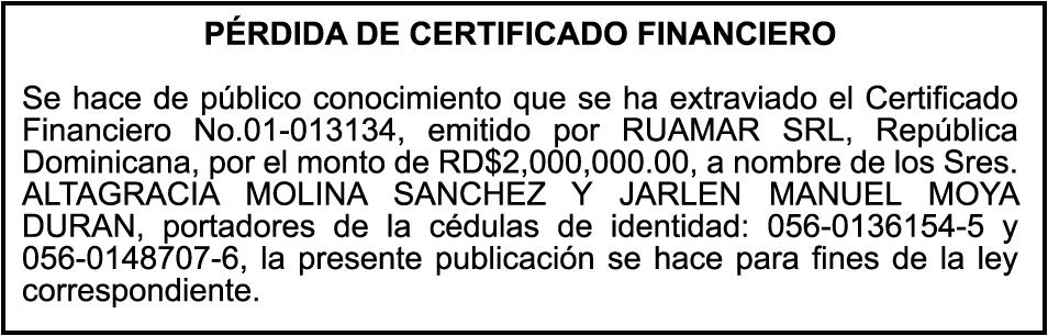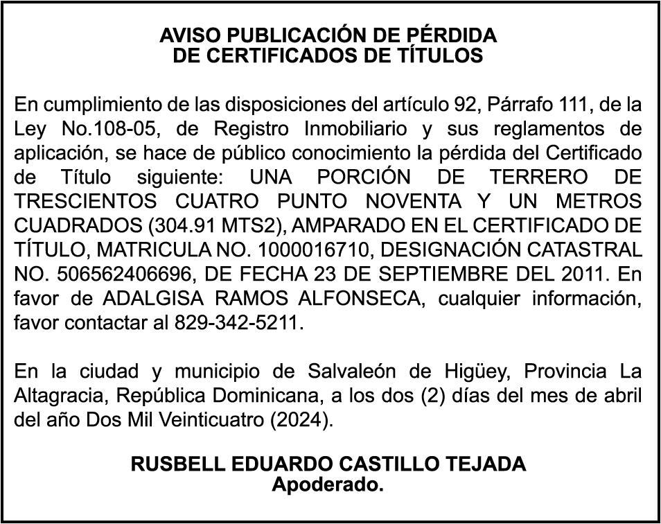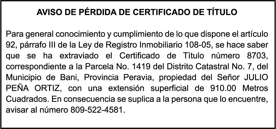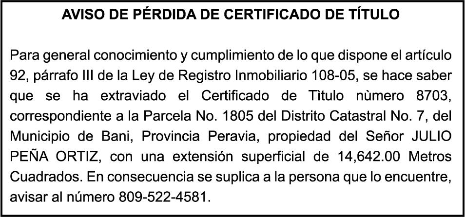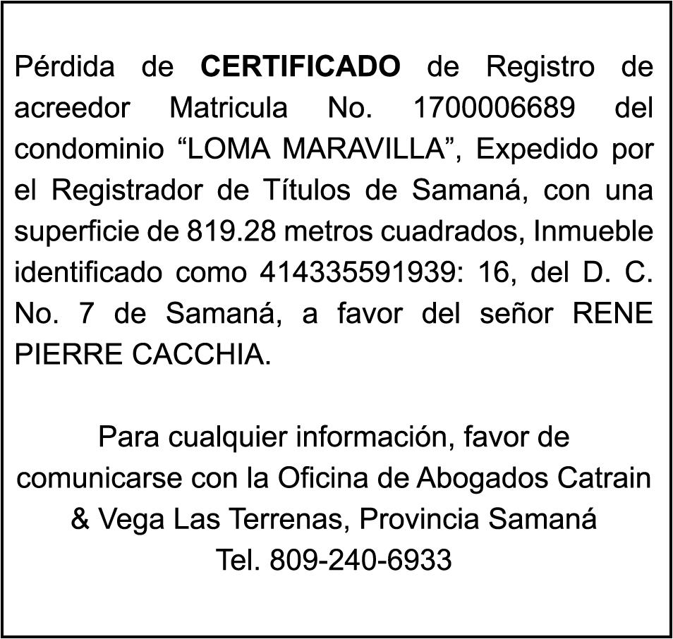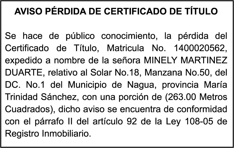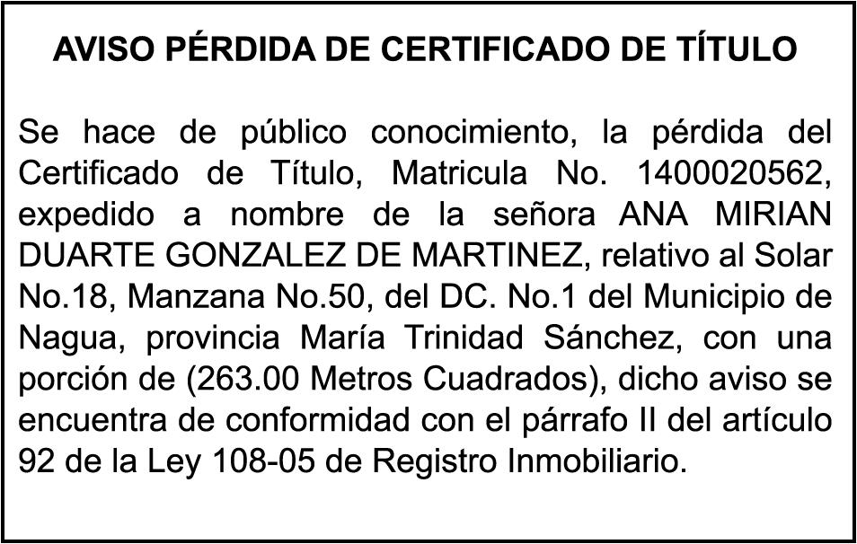 Perdida de Certificado de título No. 2000-175, ampara la parcela No.1-B-1-SUBD171, del D.C 37/1ra, con una extensión de 00HA, 02 AREAS, 22.50