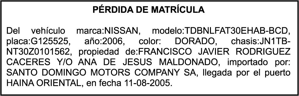 Perdida de matrícula, JEEP marca NISSAN, modelo XTERRA, año 2004, color NAZUL, chasis 5N1ED28YX4C603599, placa G207934, a nombre de JOAQUIN REYES DE LOS SANTOS.