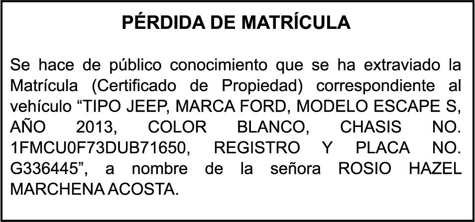 PERDIDA DE MATRICULA Veh. Carga ISUZU, modelo TFS54HDPLMEG-05A033, año 2012, color blanco, placa L302814, chasis MPATFS54HCT100174, a nombre de JESSICA MABEL VALDEZ AMARANTE.