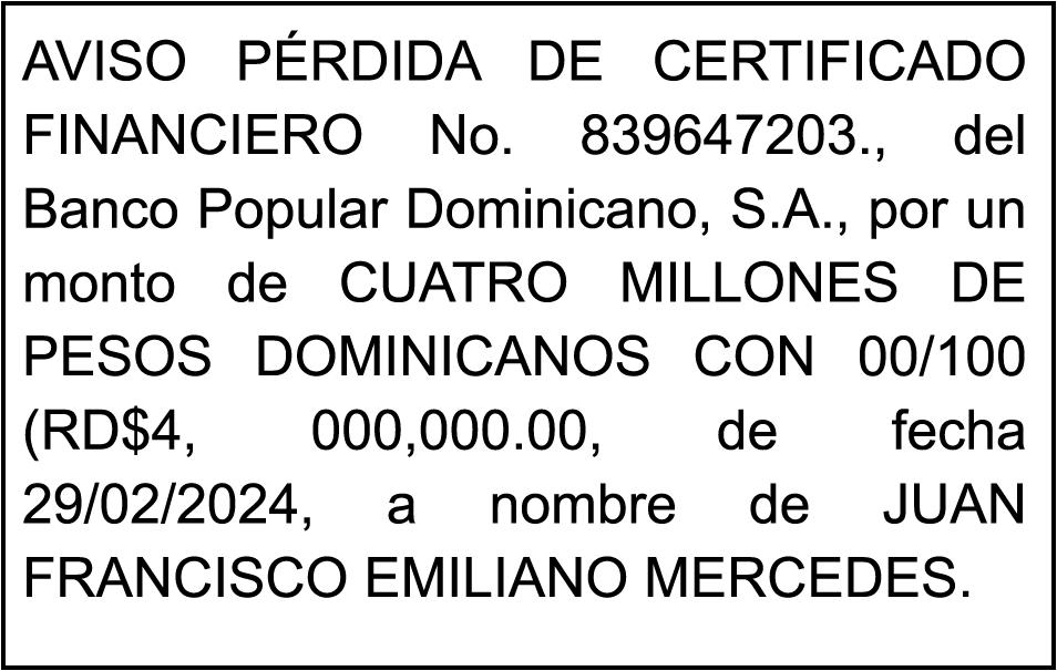 PERDIDA DE PLACA No. L472989, Veh. CARGA ISUZU, Modelo D-MAX 4WD, Color GRIS, Año 2024, Chasis MPATFS40JRT000756, a nombre de ROBERT CRUZ TRANSPORT SRL.