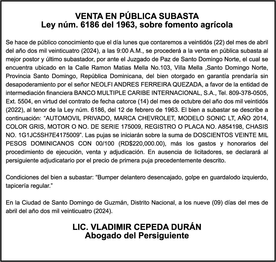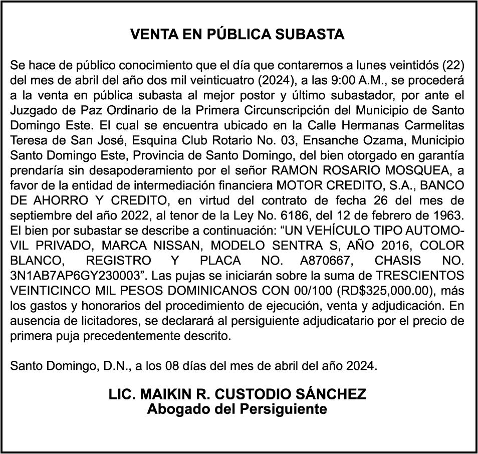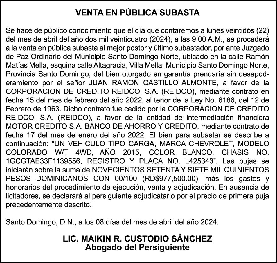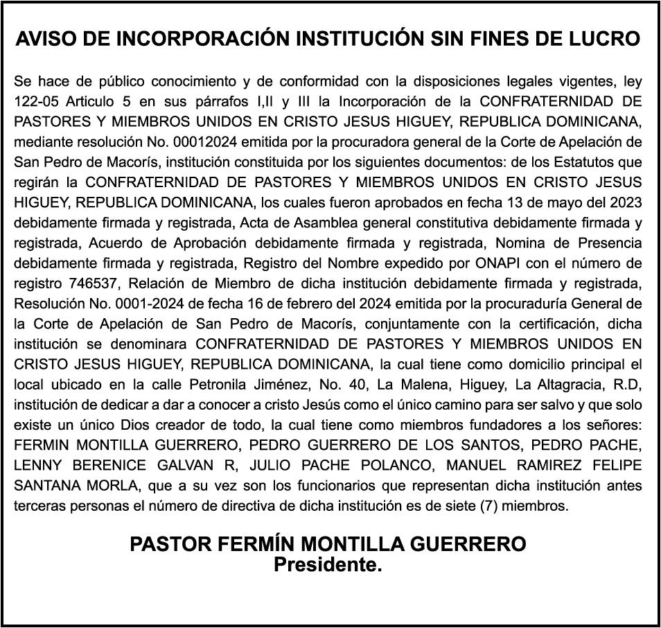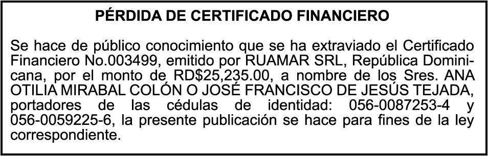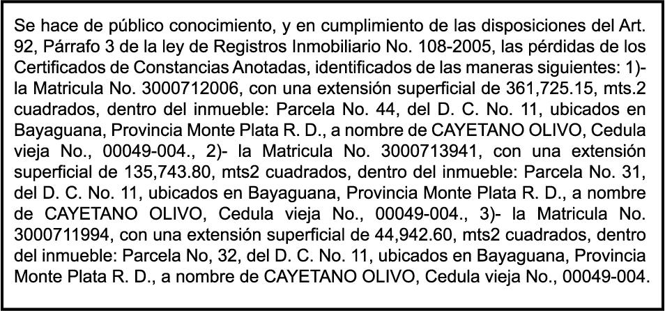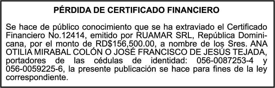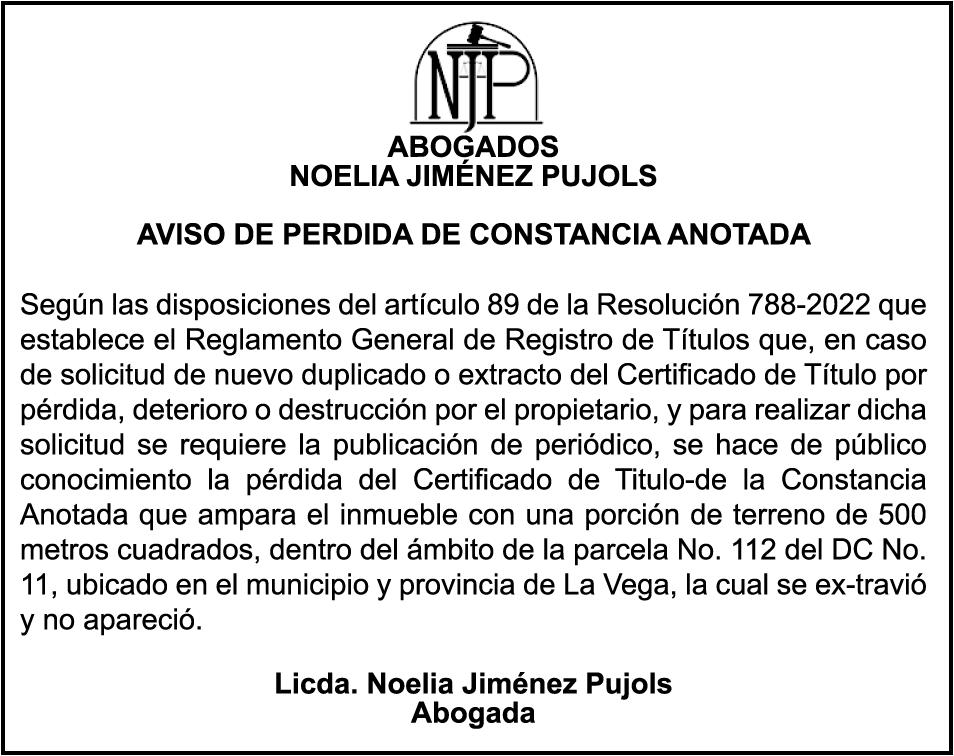 PERDIDA DE PLACA No. N857193, Motocicleta JINCHENG, Modelo AX100-BD, Color negro, Año 2012, Chasis LJCPAGLH0CS014255, a nombre de JOSE LUIS ARIAS PAULINO.