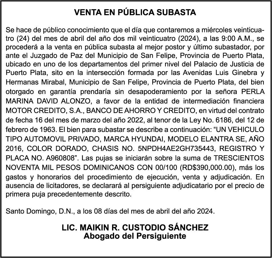 PERDIDA DE PLACA No. A941255, Automovil Privado HYUNDAI, Modelo SONATA Y20, Color GRIS, Año 2016, Chasis KMHEC41LBGA687032, a nombre de ALICIA ALTAGRACIA LOPEZ SANTOS.