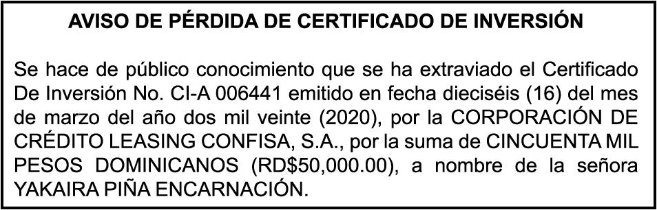 AVISO PERDIDA CERTIFICADO FNANCIERO Se hace de público conocimiento que se ha extraviado el Certificado Financiero No. 2EDDC3A650823AF32C11D24AB4194426558646, expedido por el Banco Asociacion Popular de Ahorros y Préstamos, en favor de FLORANGEL ESCANDRA PEGUERO CANELA, Cédula 40224689063, en fecha 10/04/1023, por un monto de RD$350,000, trescientos cincuenta mil pesos, según código CF-1027630316.