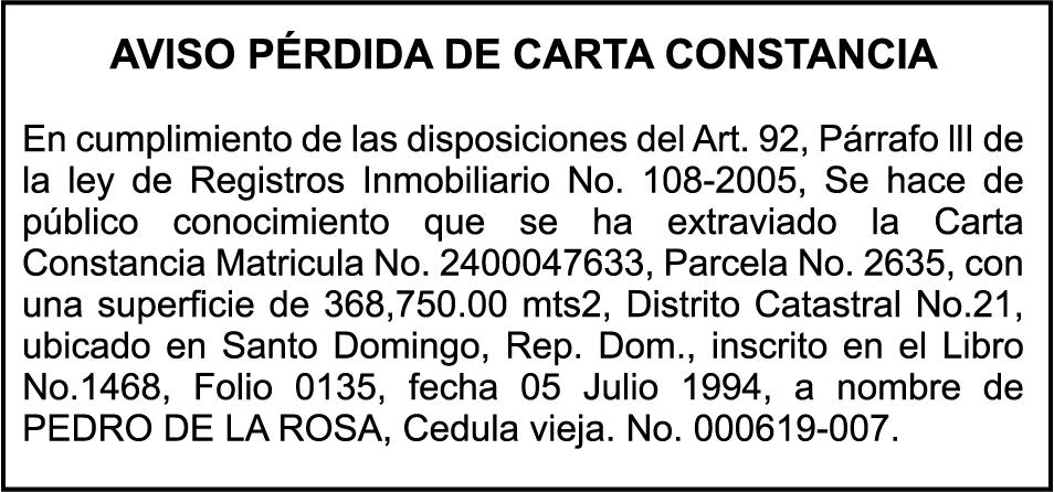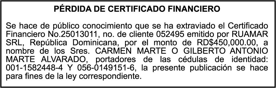 FINANCIERO Se hace de público conocimiento la pérdida del Certificado financiero No. 9606725229 (1149351), emitido por el BANCO BANRESERVAS, suc. Veron Punta Cana, Higüey por la suma de (RD$ 150,000.00) a favor de la señora MADELIN
