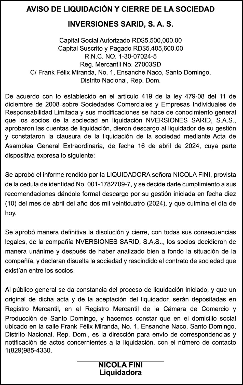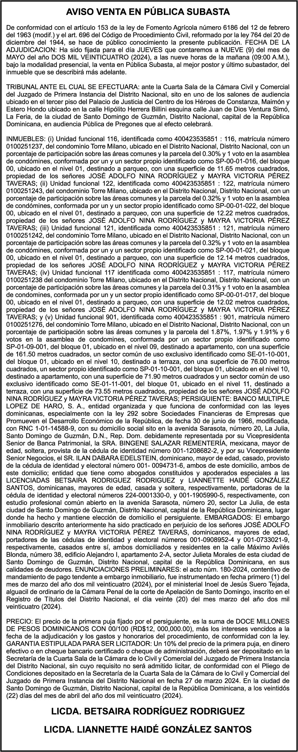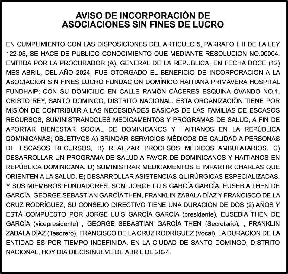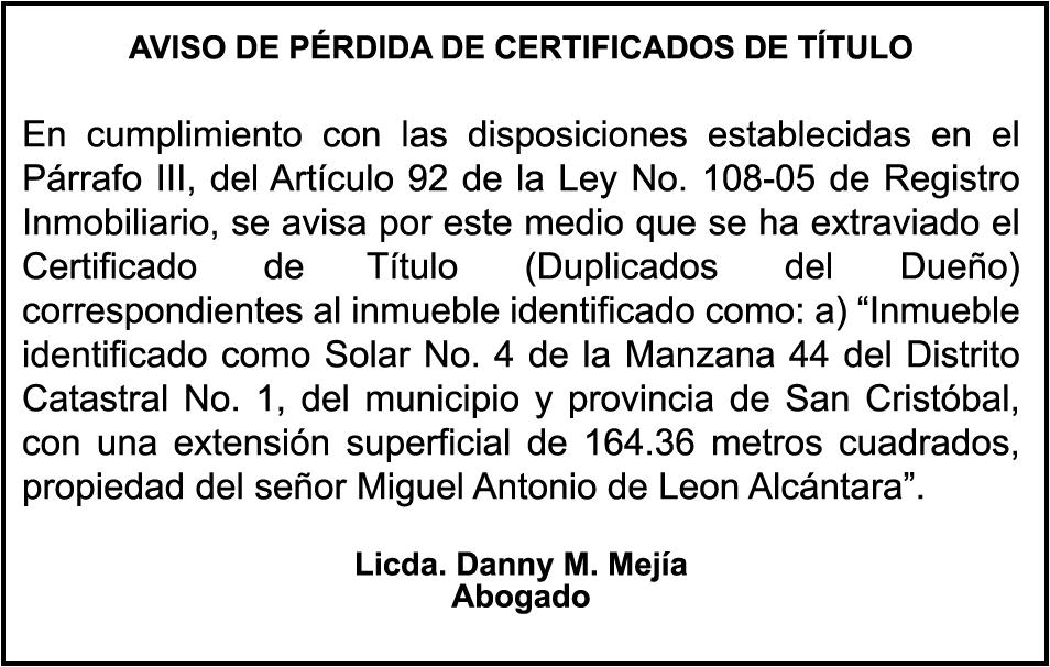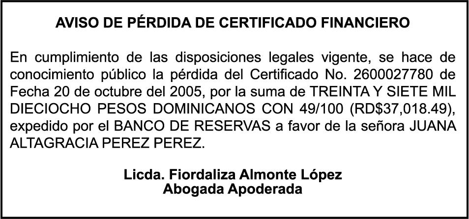 SE hace de público conocimiento la pérdida de certificado de depósito número 836844019 emitido por Banco Popular Dominicano, S. A., a favor de MAXLY STING GARCIA TAPIA, portador de la Cédula de Identidad y Electoral número 048-0098578-2, certificado expedido en fecha 19 de octubre de 2023 Por el Monto (US$158,457.68), más intereses generados a la fecha.