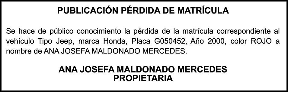 PERDIDA DE PLACA:N0. K0269482, Chasis C509840570, Marca HONDA, Modelo C50, Color VERDE, AñO 1984, a nombre de MANUEL ANTONIO RODRIGUEZ ULLOA, CEd. 04700601638