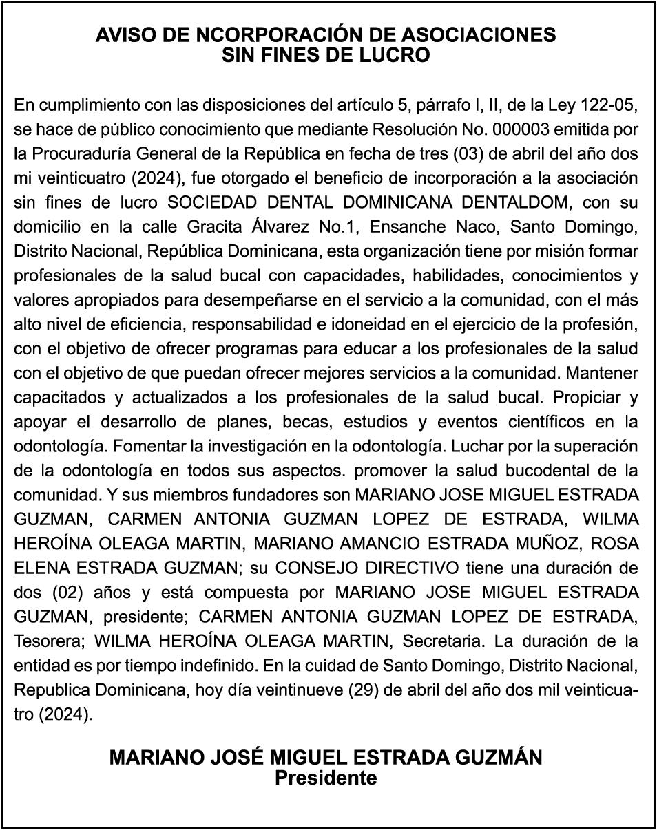 PERDIDA DE MATRICULA Veh. Carga DAIHATSU, modelo S221LV-ZMLF, color blanco, año 1995, placa L083158, chasis JDA000S8500055440, a nombre de ERCILIO DE JESUS UREÑA. SE hace de público conocimiento la pérdida de certificado de depósito número 835878240 emitido por Banco Popular Dominicano, S. A., a favor de AILEEN DASHELL DE LEON DE LOS SANTOS, dominicana, mayor de edad, casada, domiciliado y residente en esta ciudad, portadora de la Cédula de Identidad y Electoral número 402-0954511-6 Y ANDRES ELIAZAR MATAR DE LOS SANTOS dominicano, mayor de edad, soltero, con elección de domicilio en esta ciudad, portadora de la Cédula de Identidad y Electoral número 012-0077704-1, certificado expedido en fecha 1 de septiembre de 2023 Por el Monto ((RD$900,000.00), más intereses generados a la fecha.