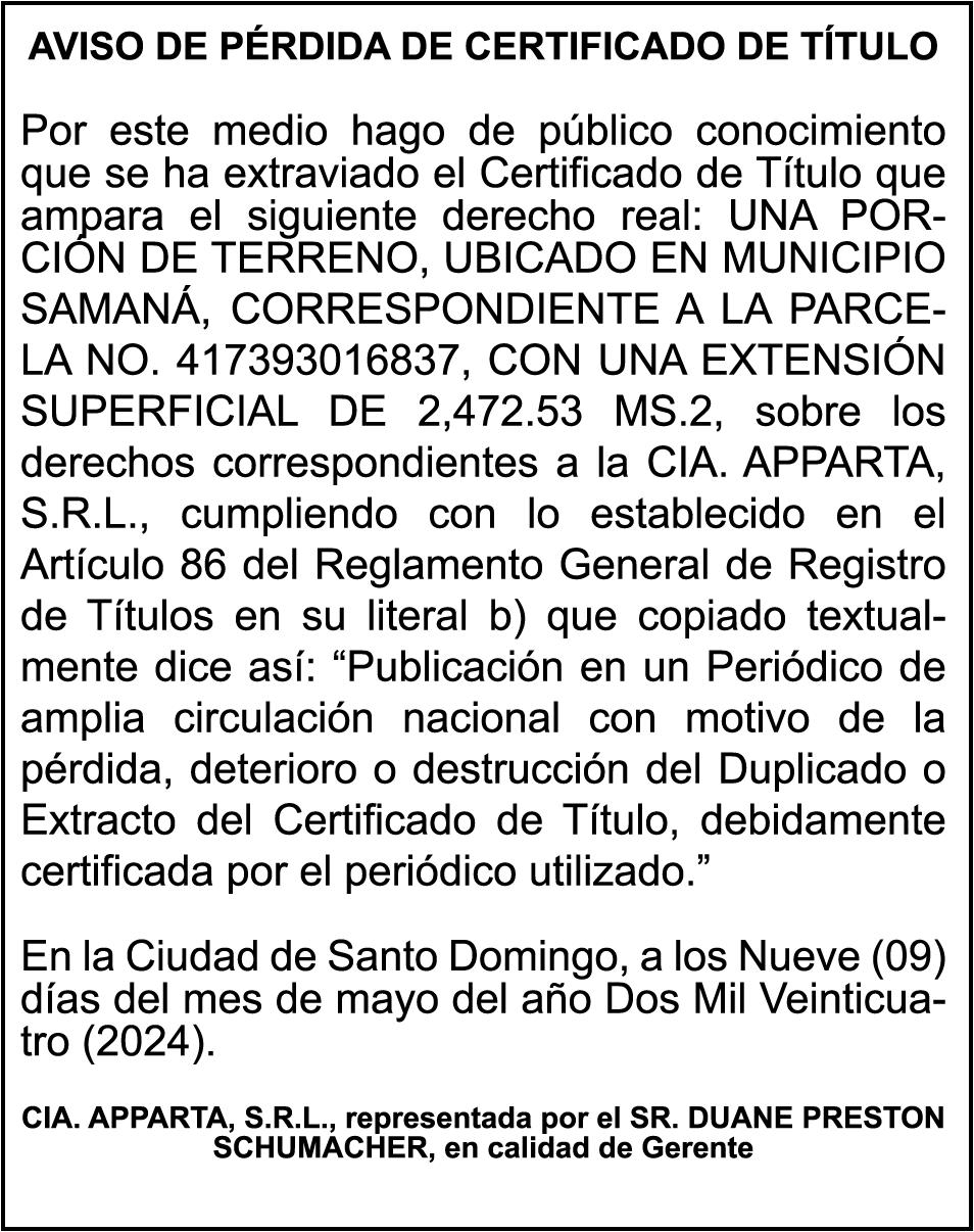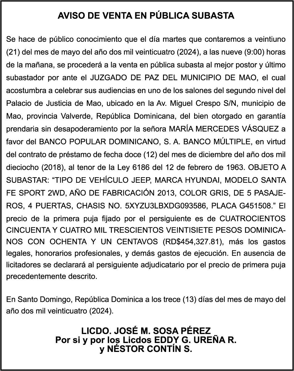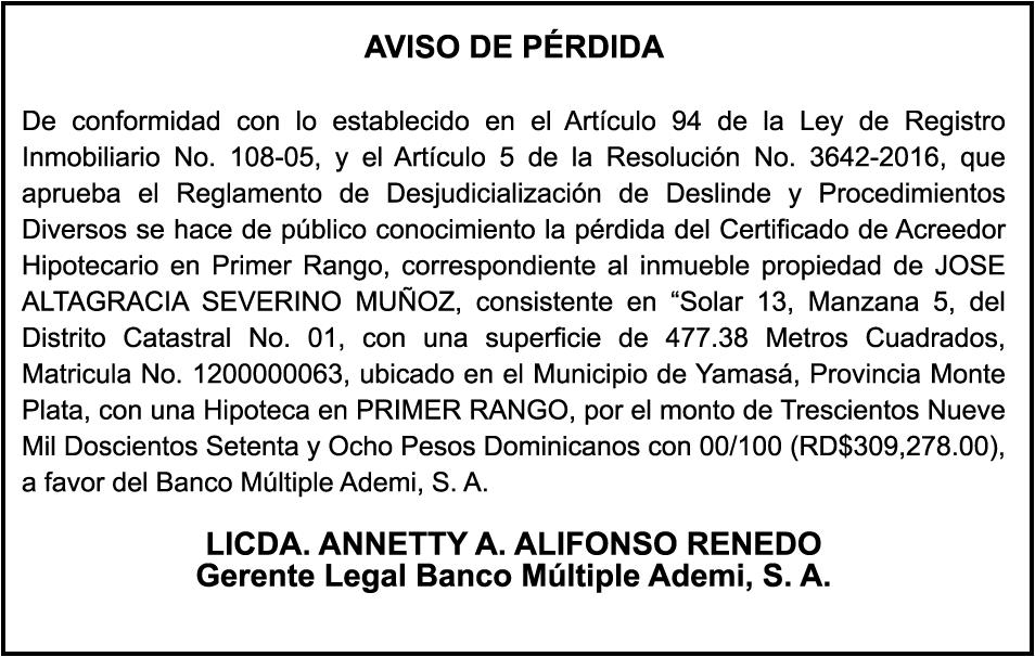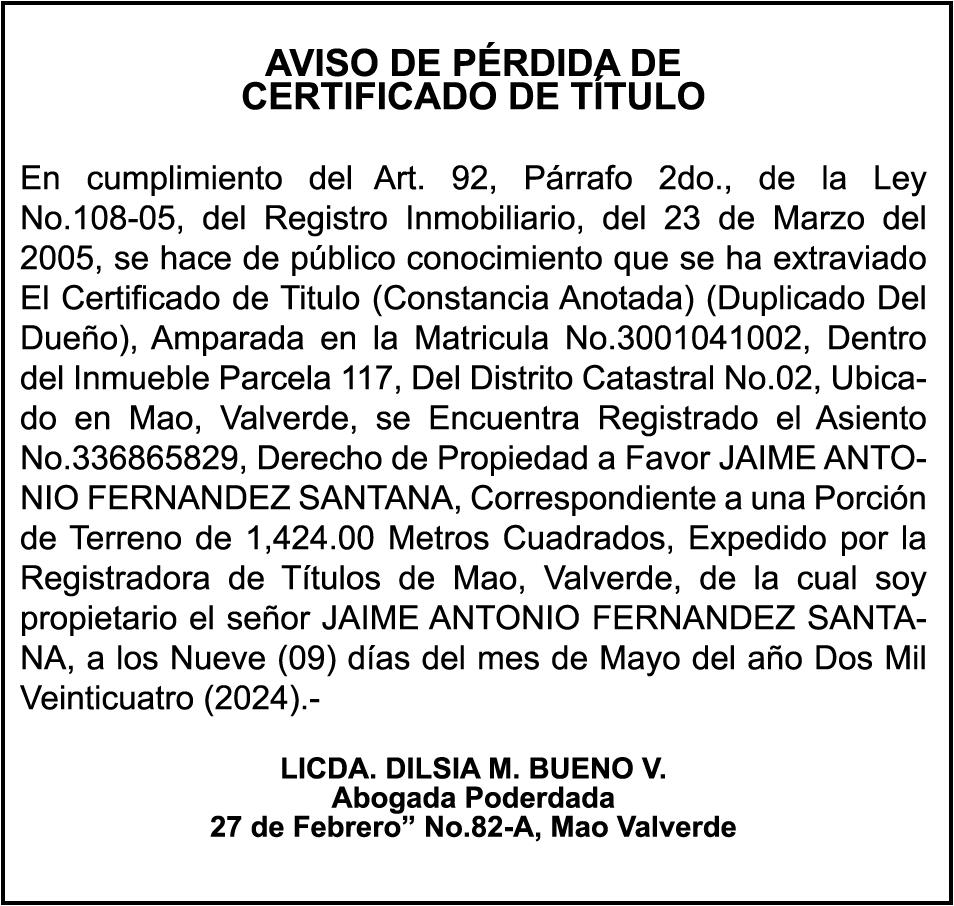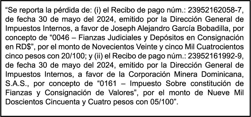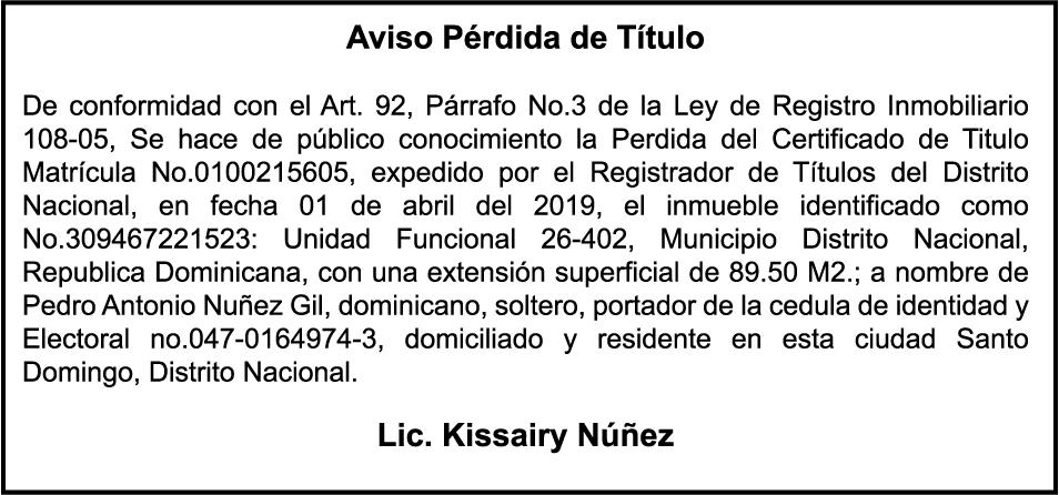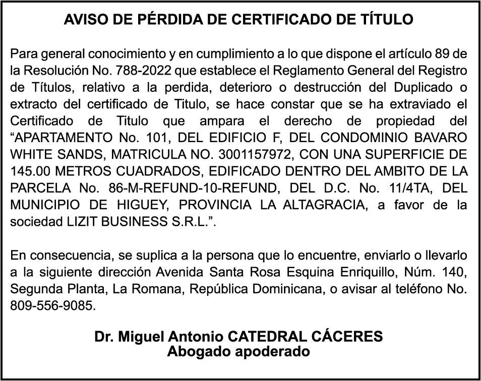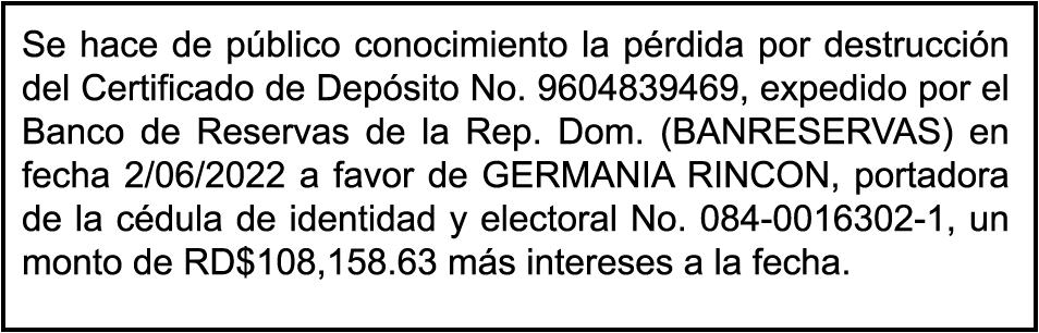 SE hace de público conocimiento la pérdida de certificado de depósito número 827153586 emitido por Banco Popular Dominicano, S. A., a favor de YOKASTY CASTRO DE PEREZ, portador de la Cédula de Identidad y Electoral número 093-00504074, certificado expedido en fecha 6 de abril de 2022 Por el Monto (RD$4,317,560.10), más intereses generados a la fecha.