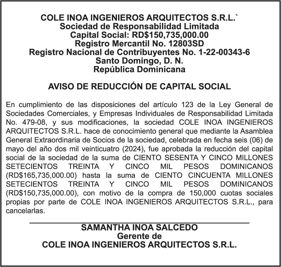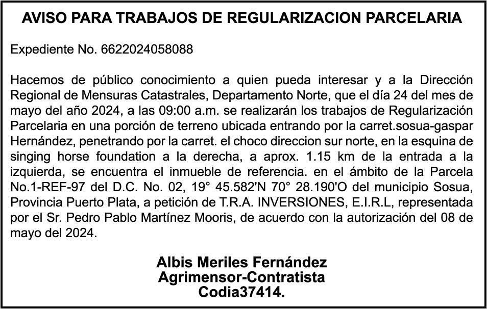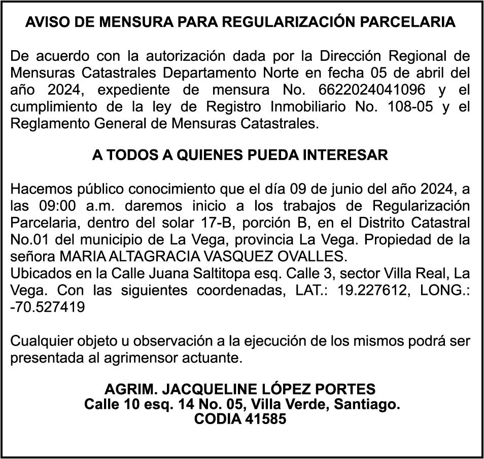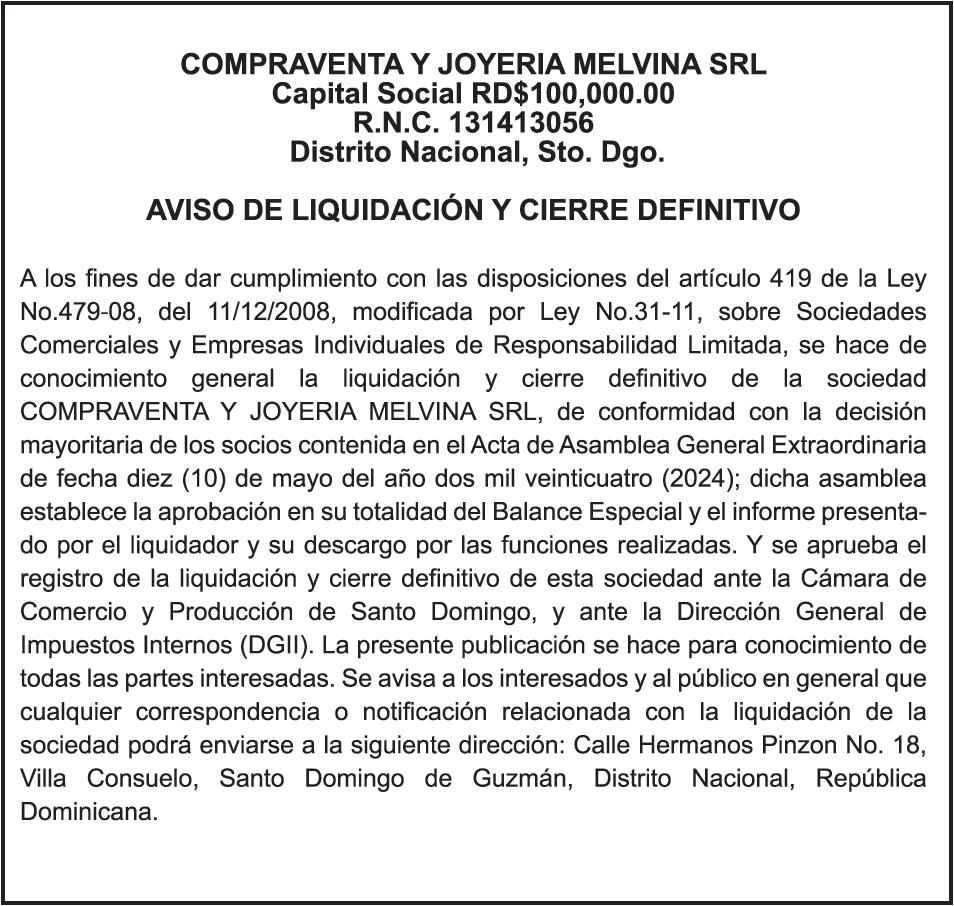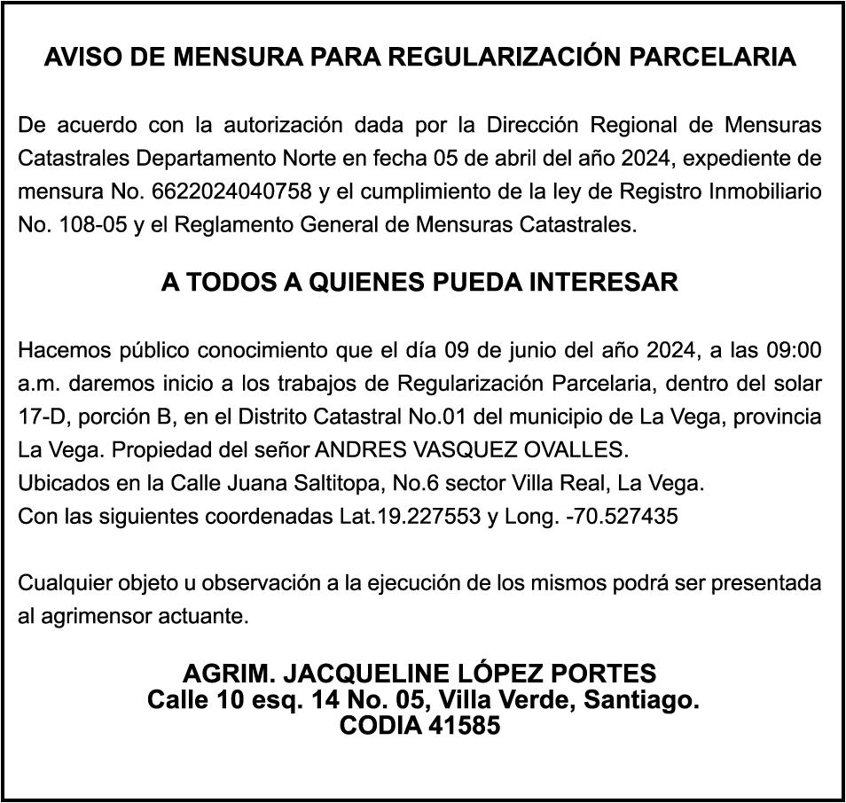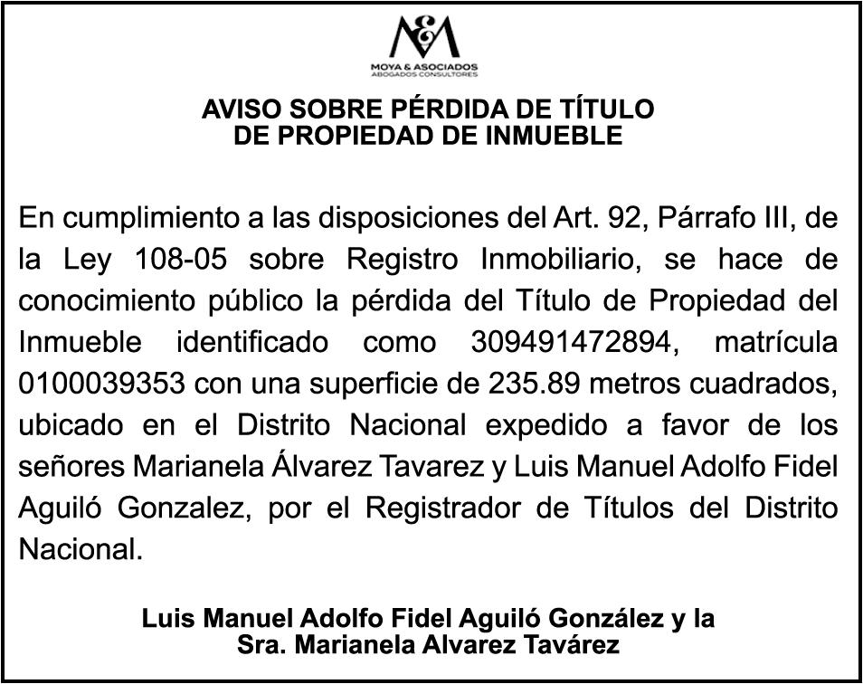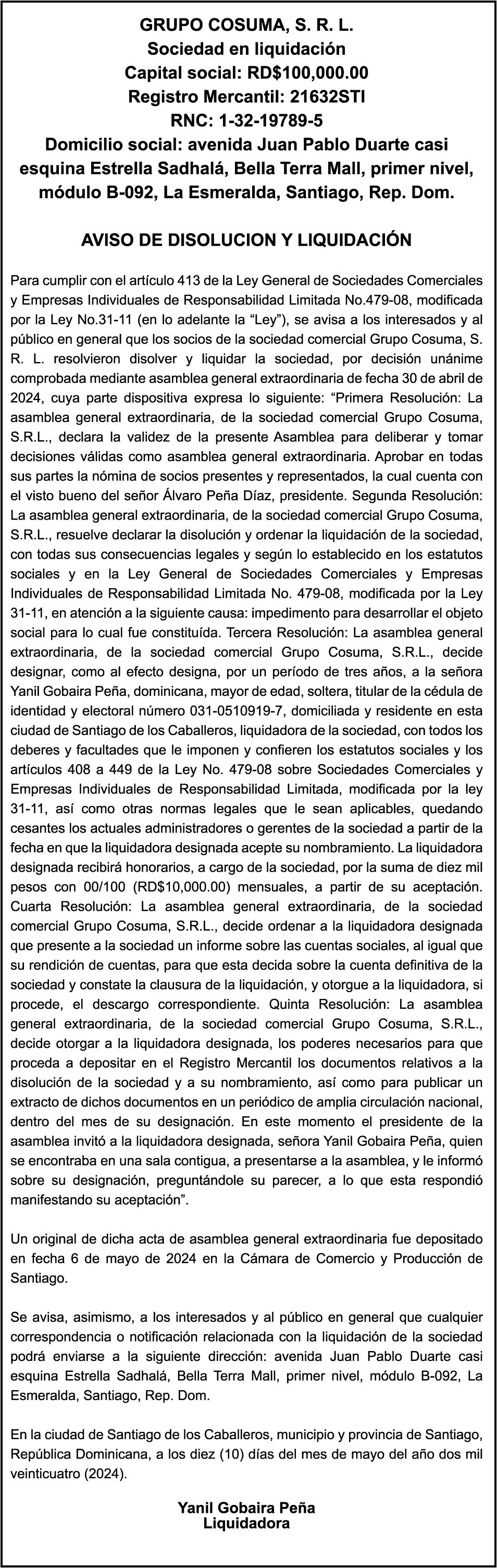 SE hace de público conocimiento la pérdida de certificado de depósito número 827153586 emitido por Banco Popular Dominicano, S. A., a favor de YOKASTY CASTRO DE PEREZ, portador de la Cédula de Identidad y Electoral número 093-00504074, certificado expedido en fecha 6 de abril de 2022 Por el Monto (RD$4,317,560.10), más intereses generados a la fecha.