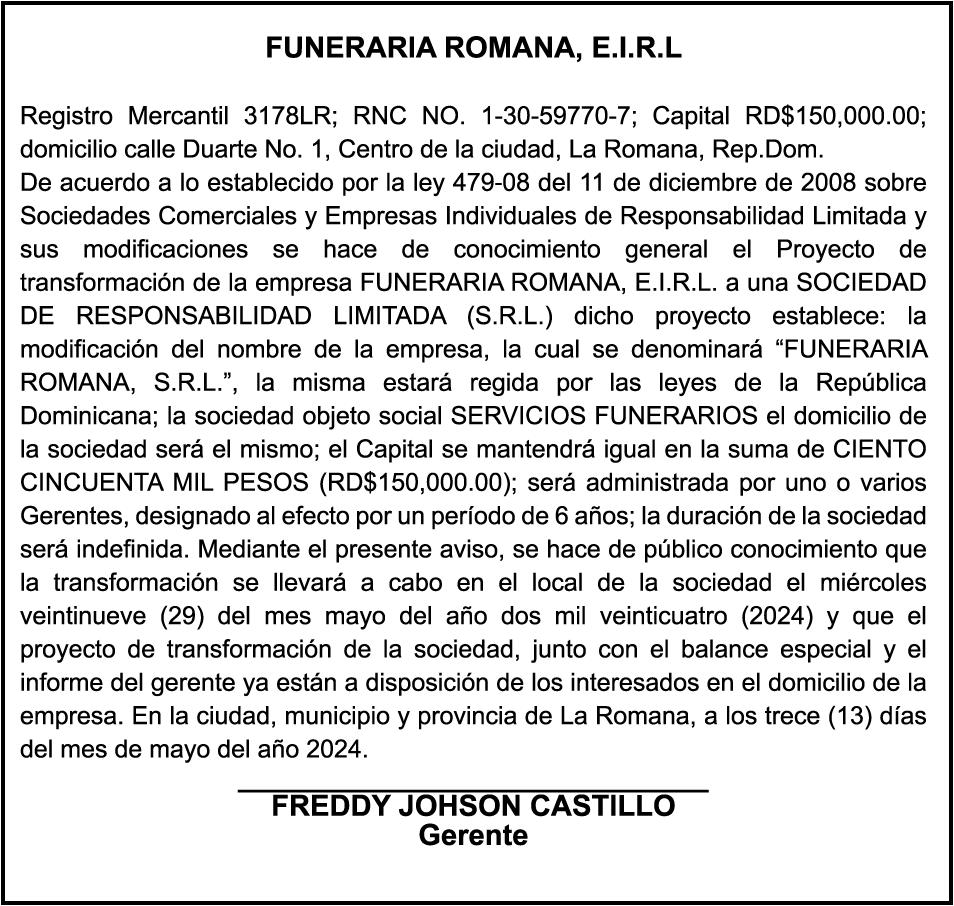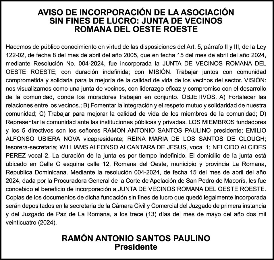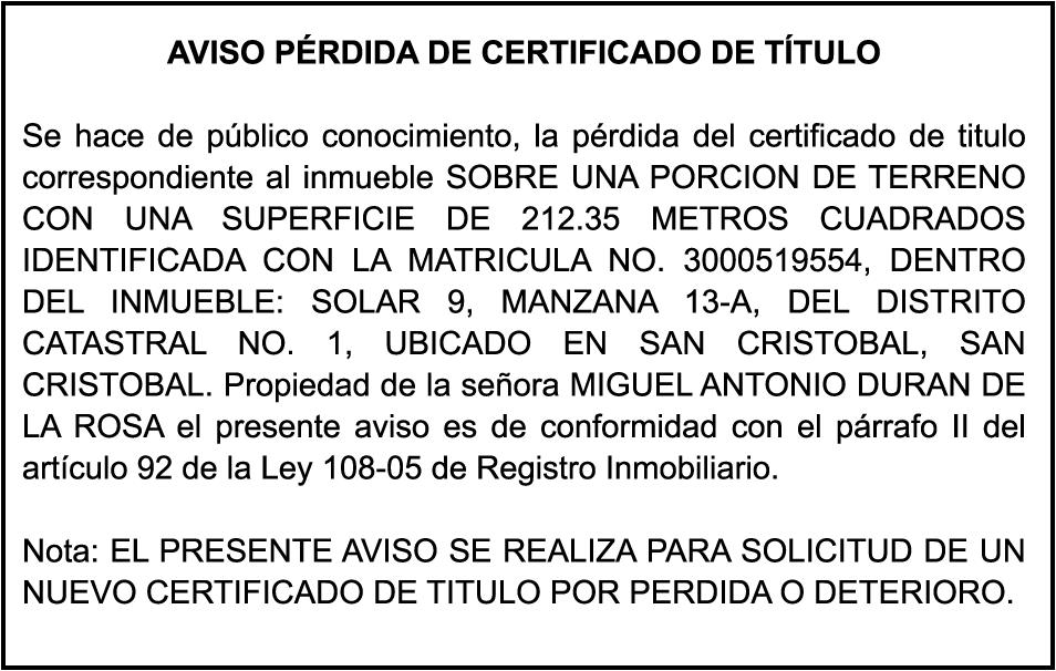 SE hace de público conocimiento la pérdida de certificado de depósito número 817730963 emitido por Banco Popular Dominicano, S. A., a favor de ROMAN ALBERTO RODRIGUEZ RODRIGUEZ, portador de la Cédula de Identidad y Electoral número 001-1331874-5, certificado expedido en fecha 9 de marzo de 2020 Por el Monto (RD$16,248.98), más intereses generados a la fecha.