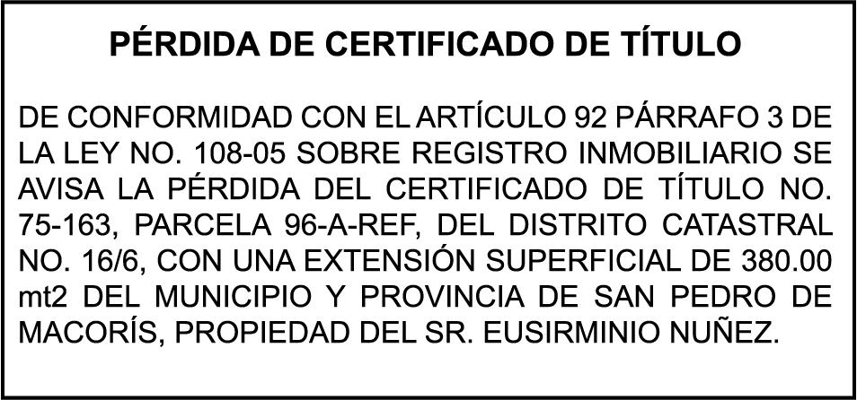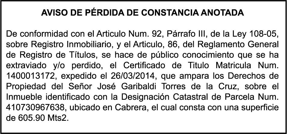SE hace de público conocimiento la pérdida de certificado de depósito número 810078253 emitido por Banco Popular Dominicano, S. A., a favor de MIGUELINA MAZARA DIAZ, portadora de la Cédula de Identidad y Electoral número 223-0007694-4, certificado expedido en fecha fecha 8 de octubre de 2018 Por el Monto (RD$172,837.27), más intereses generados a la fecha.