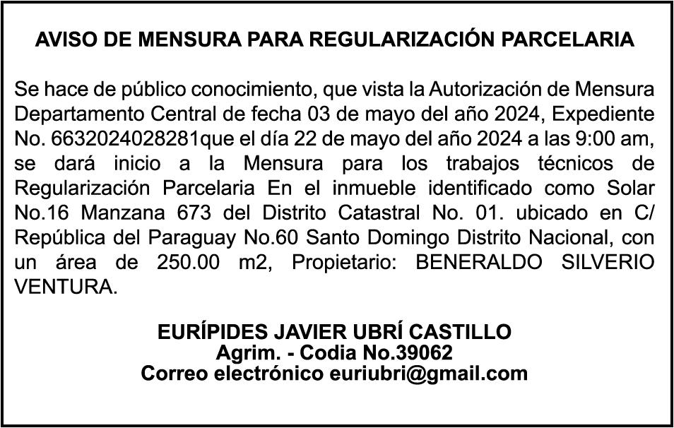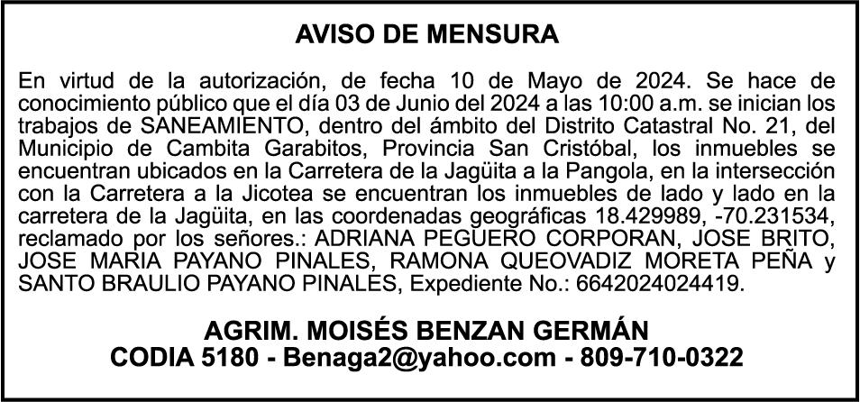 AVISO: TRASPASO DE EMBARCACION. El señor RAFAEL ENRIQUE CAMENERO FLORES, TRASPASA EL BOTE DE RECREO DE NOMBRE “OMAIRA”, MATRICULA. NO. BR-O6-486BCH, DE 24.0 PIES DE ESLORA, COLOR BLANCO, AL SEÑOR OMAR RAUL BRITO PIÑA, COMO NUEVO PROPIETARIO.