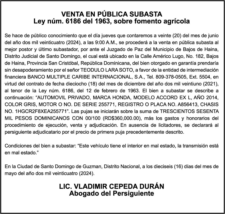 AVISO: TRASPASO DE EMBARCACION. El señor ANDRES MOREL DE LA PAZ, TRASPASA EL BOTE DE RECREO DE NOMBRE “ARIANNA-II”, MATRICULA. NO. BR-A538-5224SDG, DE 21.0 PIES DE ESLORA, COLOR BLANCO Y AZUL, AL SEÑOR BERNARDO GALAN JOSE, COMO NUEVO PROPIETARIO.