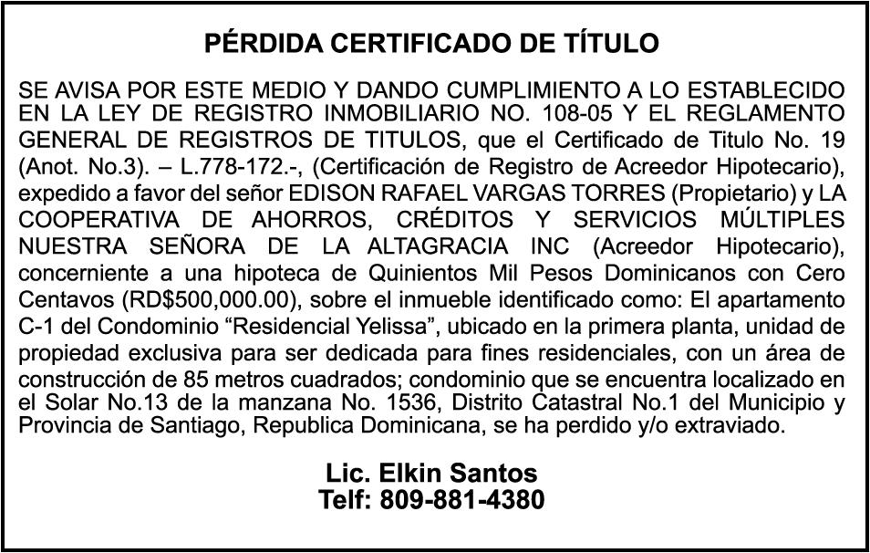 PERDIDA DE PLACA No. L253144, Veh. CARGA DAIHATSU, Modelo HI JET, Color BLANCO, Año 1998, Chasis S100P027162, a nombre de VICTORIANO SUERO DE LOS SANTOS.