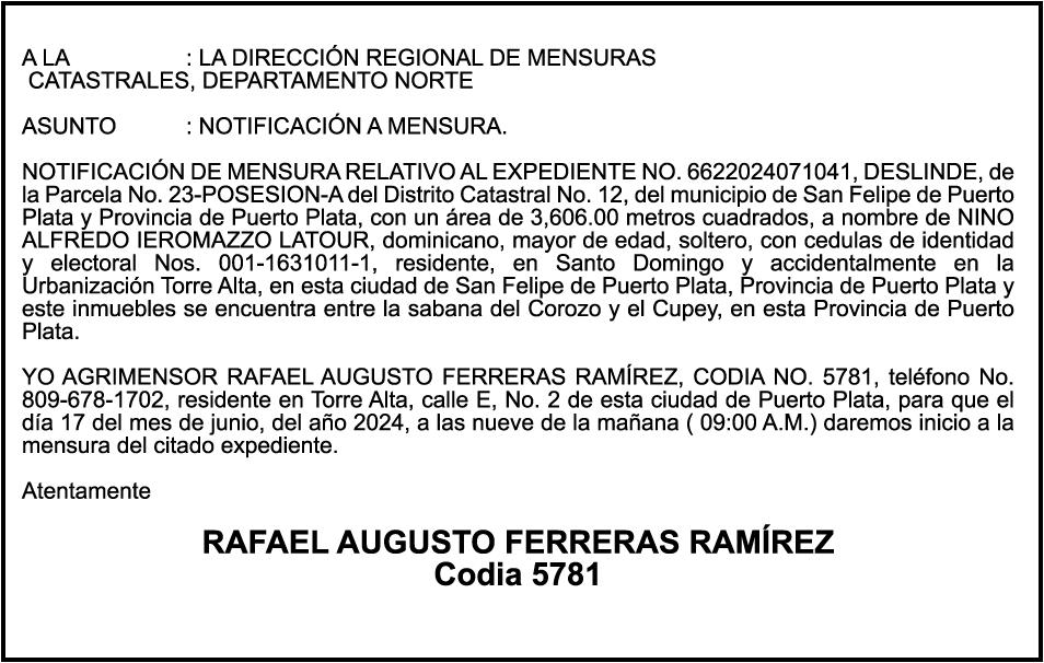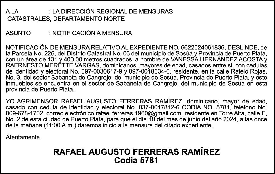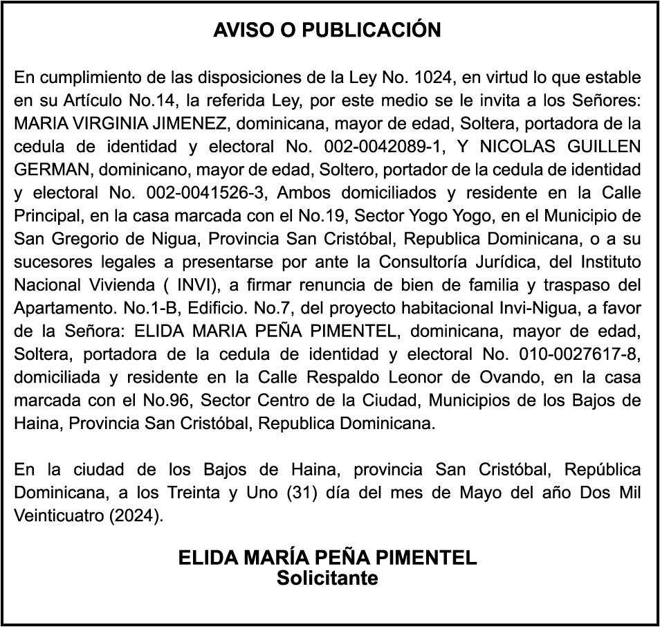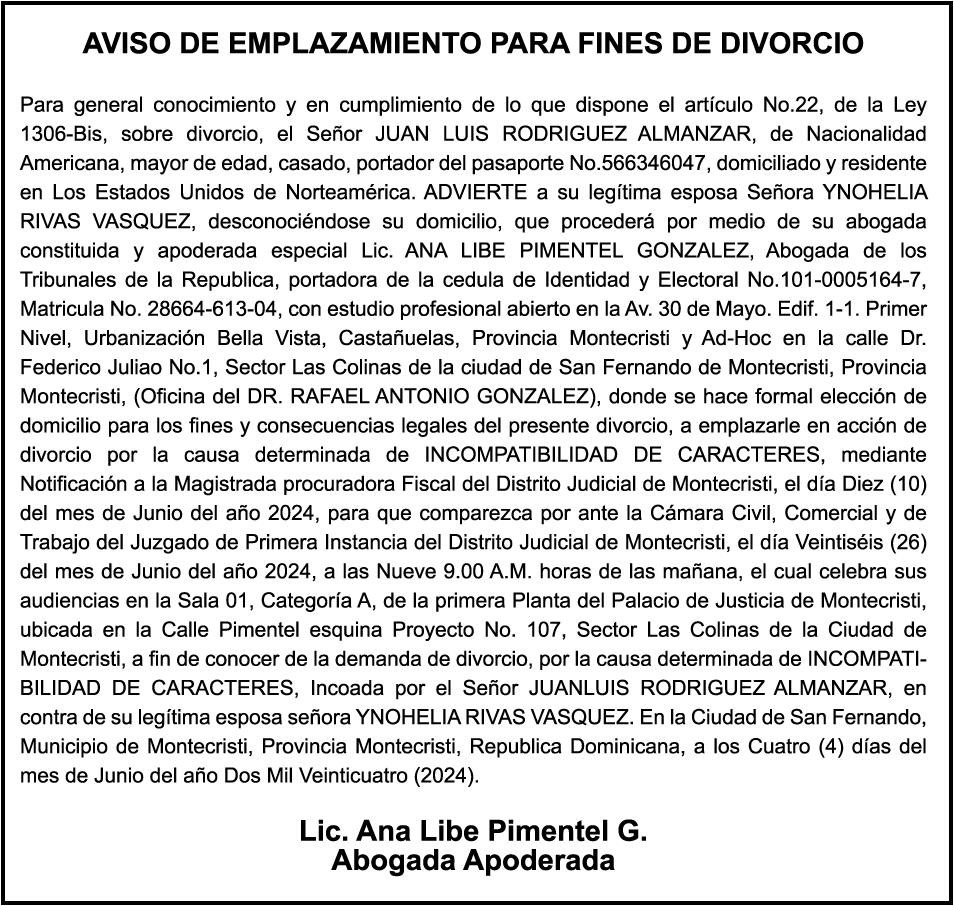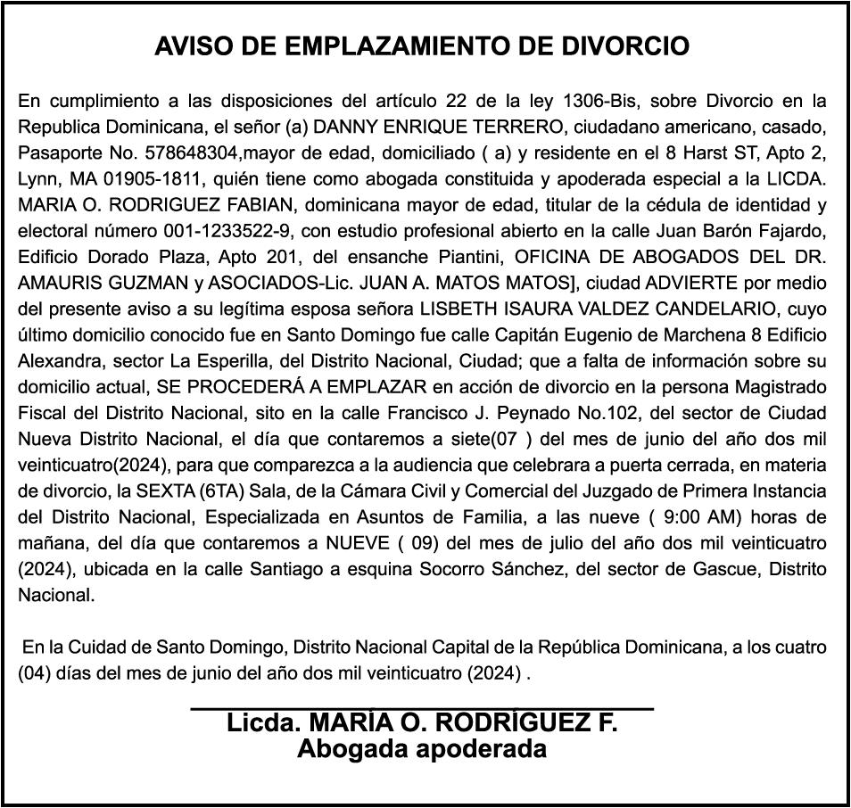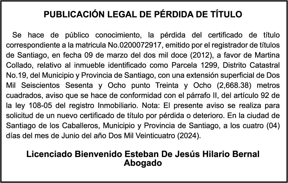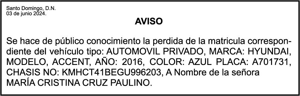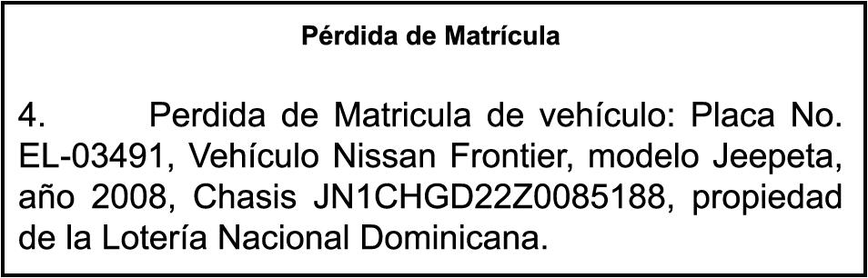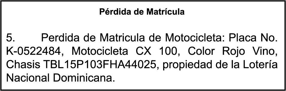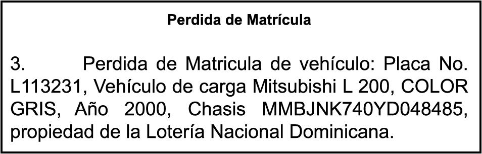 PERDIDA DE MATRICULA Automóvil Privado HONDA, Modelo ACCORD LX, Color gris, Año 1998, Placa A436659, Chasis 1HGCG5646WA084247, a nombre de LUIS ARELIS LUNA. AVISO: cambio de nombre de embarcación. Se hace de público conocimiento, que se le está cambiando el nombre a la lancha de recreo de nombre “SCAMMROK”, de 42.0 pies de eslora, matriculado en el puerto de Samaná, bajo el No. LP-S3-072BS, propiedad del señor SHAVANE DELANO TURQUEST , para que en lo adelante se haga figurar con el nombre de “CHAI BELLA”, en vez del primero.