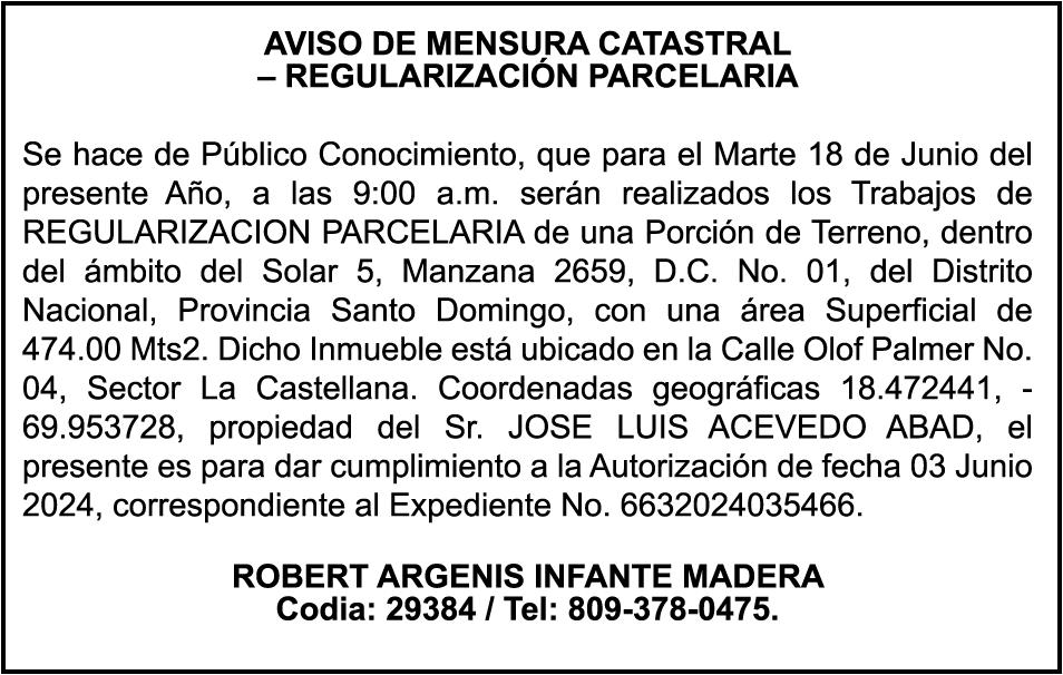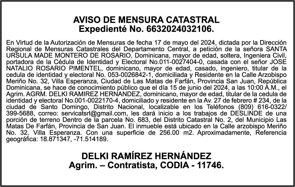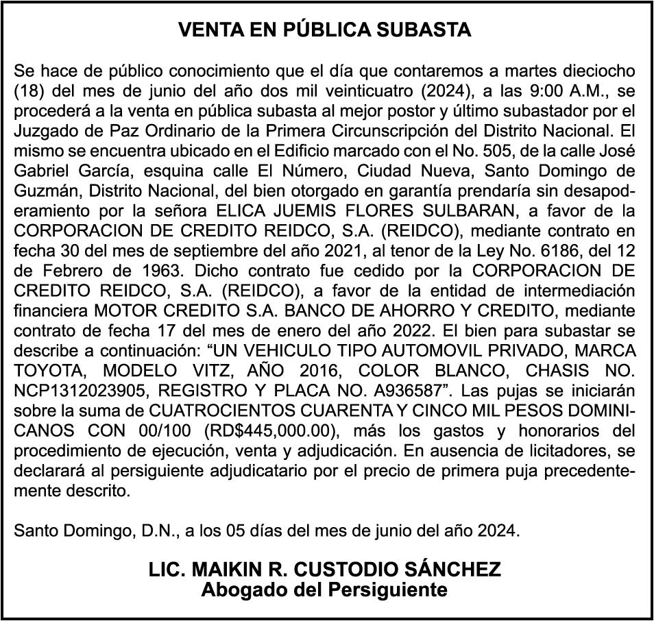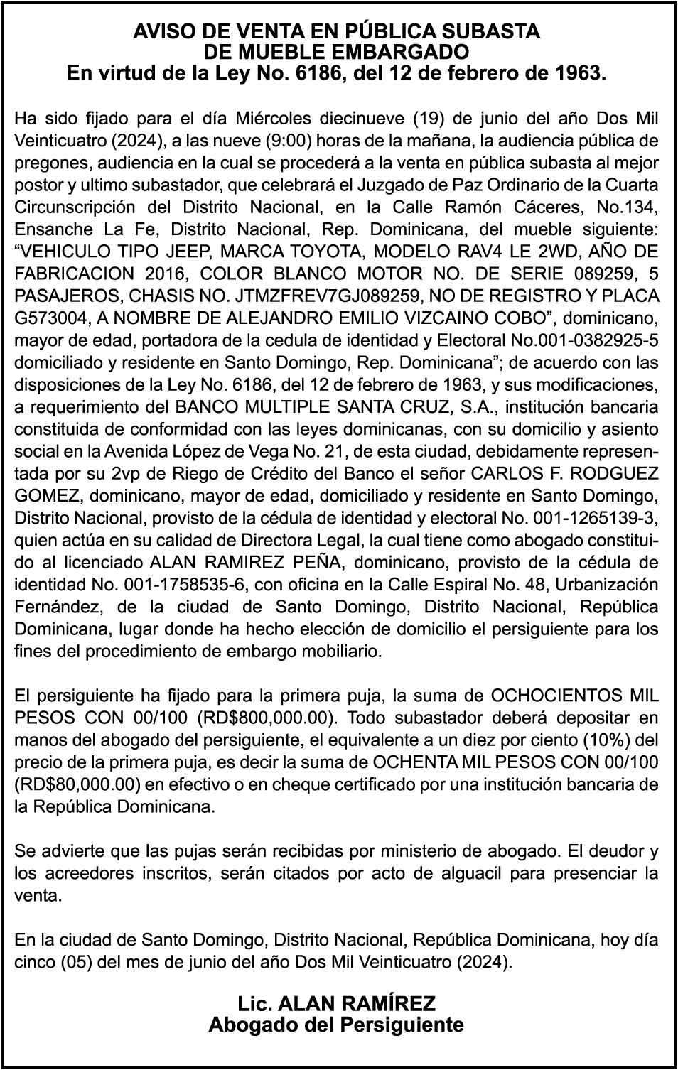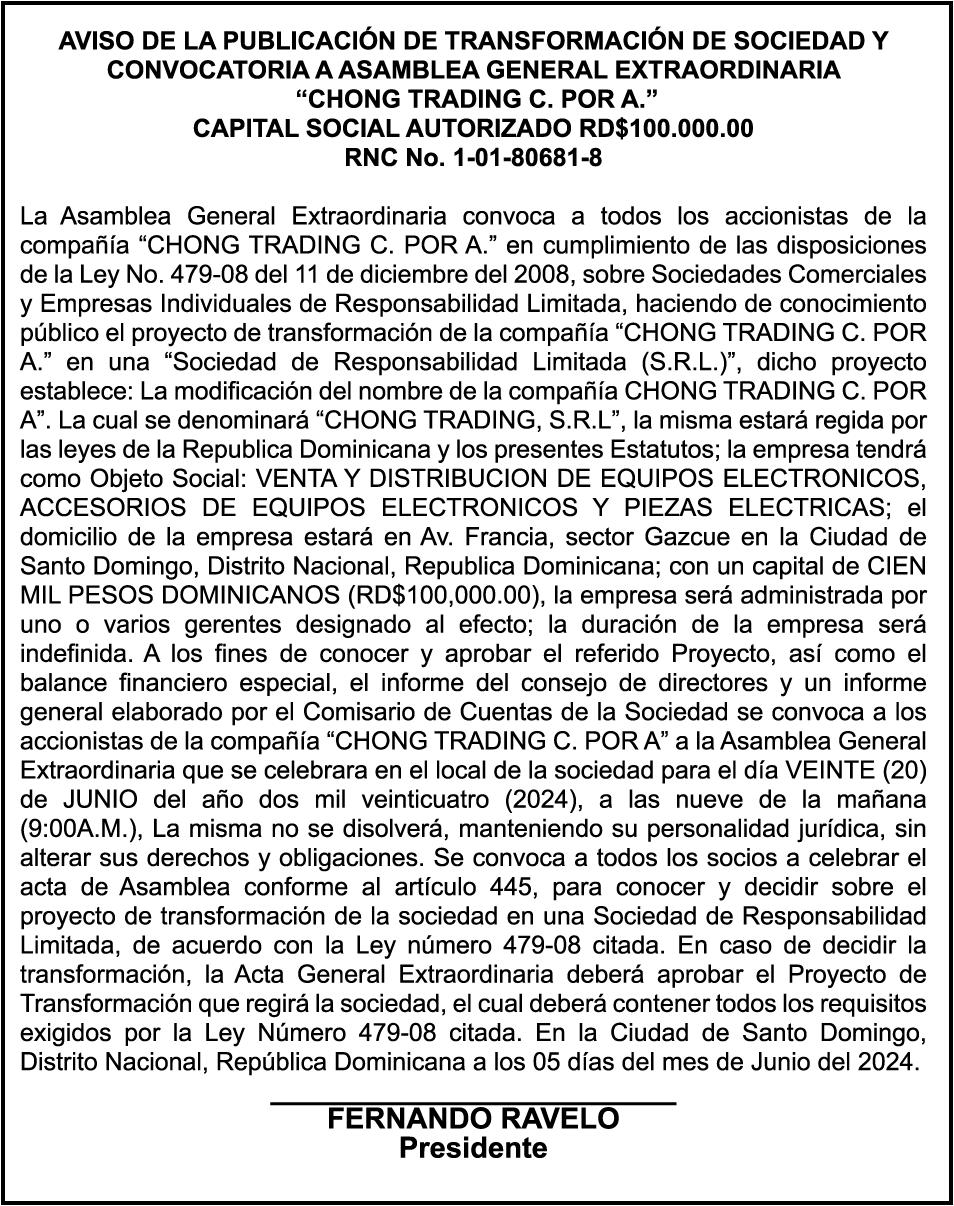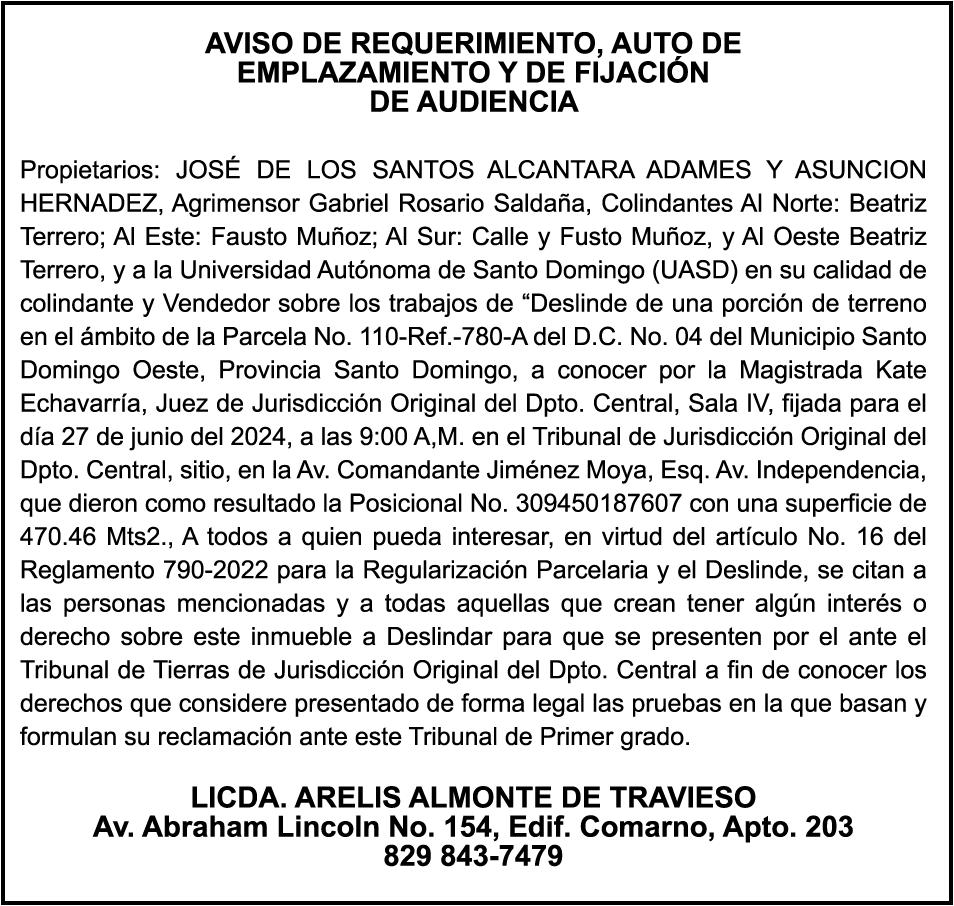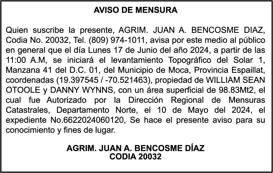 PERDIDA DE MATRICULA Automóvil Privado HONDA, Modelo ACCORD LX, Color gris, Año 1998, Placa A436659, Chasis 1HGCG5646WA084247, a nombre de LUIS ARELIS LUNA. AVISO: cambio de nombre de embarcación. Se hace de público conocimiento, que se le está cambiando el nombre a la lancha de recreo de nombre “SCAMMROK”, de 42.0 pies de eslora, matriculado en el puerto de Samaná, bajo el No. LP-S3-072BS, propiedad del señor SHAVANE DELANO TURQUEST , para que en lo adelante se haga figurar con el nombre de “CHAI BELLA”, en vez del primero.