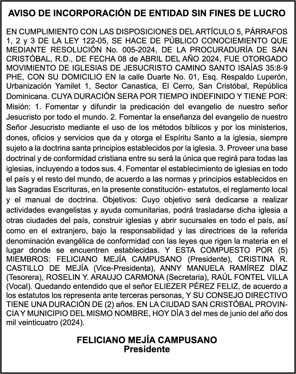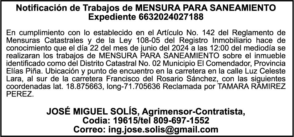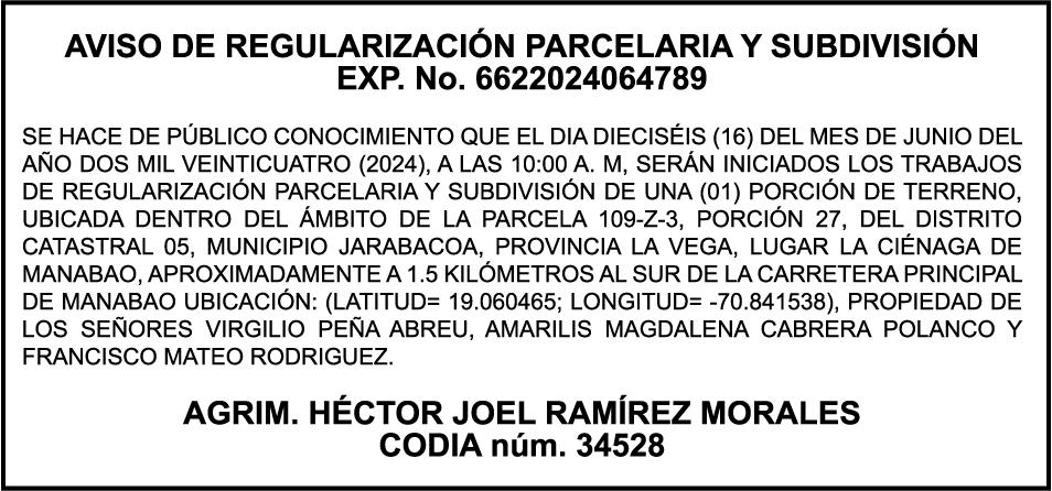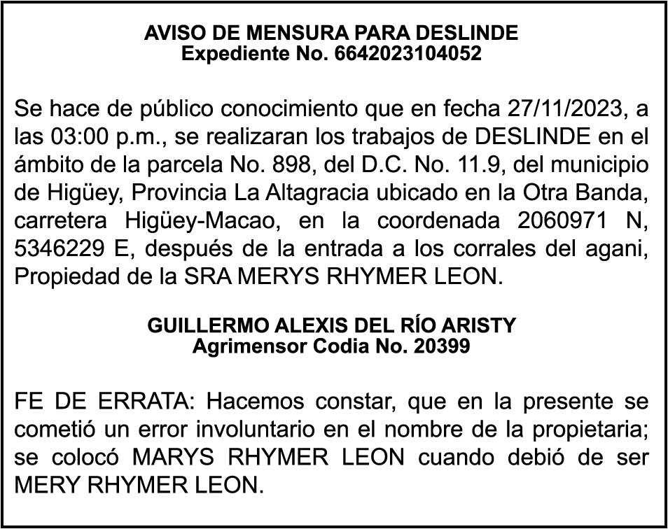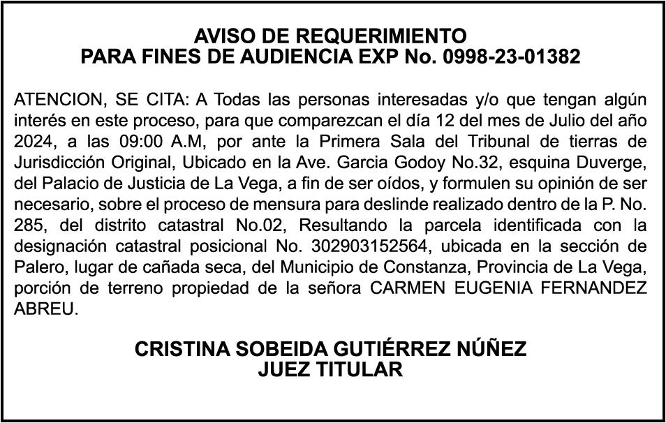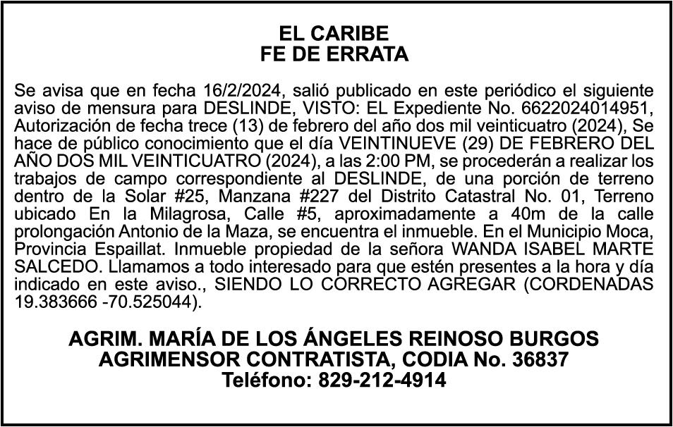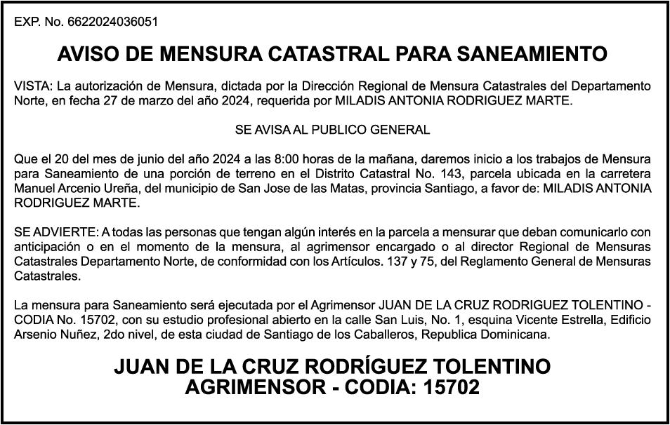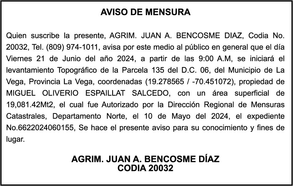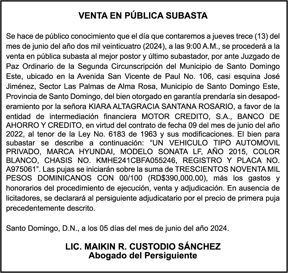 PERDIDA DE MATRICULA Automóvil Privado HONDA, Modelo ACCORD LX, Color gris, Año 1998, Placa A436659, Chasis 1HGCG5646WA084247, a nombre de LUIS ARELIS LUNA. AVISO: cambio de nombre de embarcación. Se hace de público conocimiento, que se le está cambiando el nombre a la lancha de recreo de nombre “SCAMMROK”, de 42.0 pies de eslora, matriculado en el puerto de Samaná, bajo el No. LP-S3-072BS, propiedad del señor SHAVANE DELANO TURQUEST , para que en lo adelante se haga figurar con el nombre de “CHAI BELLA”, en vez del primero.
