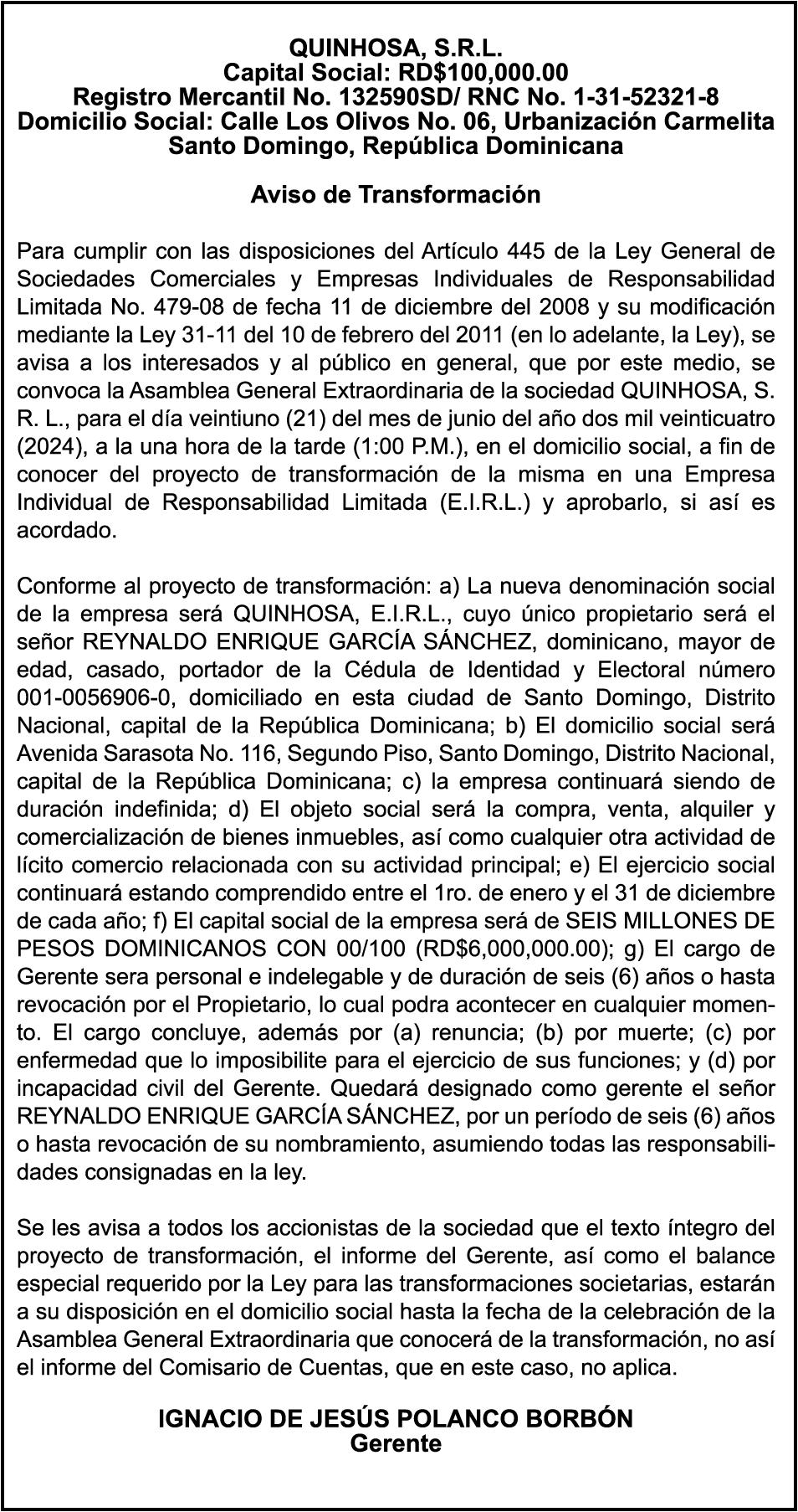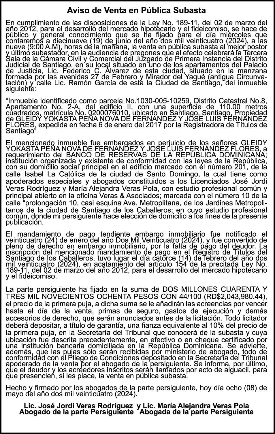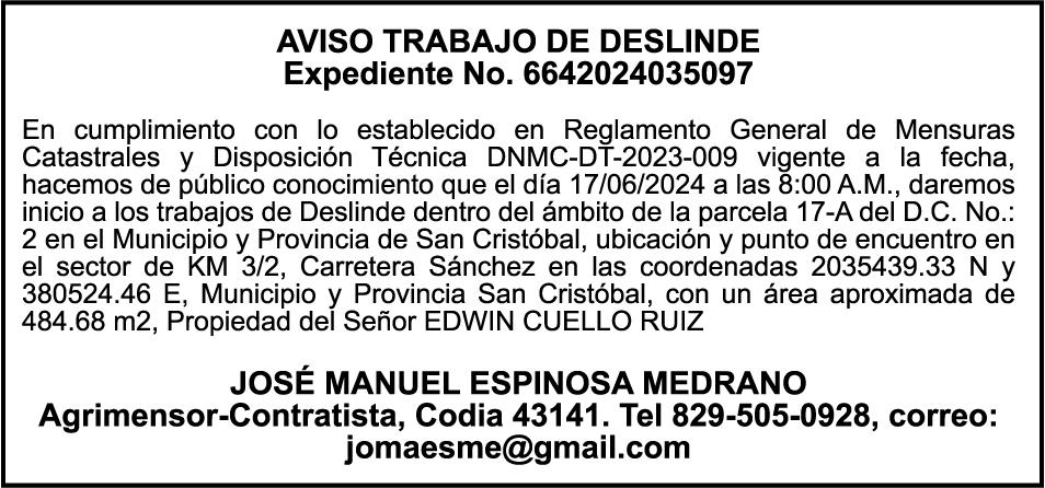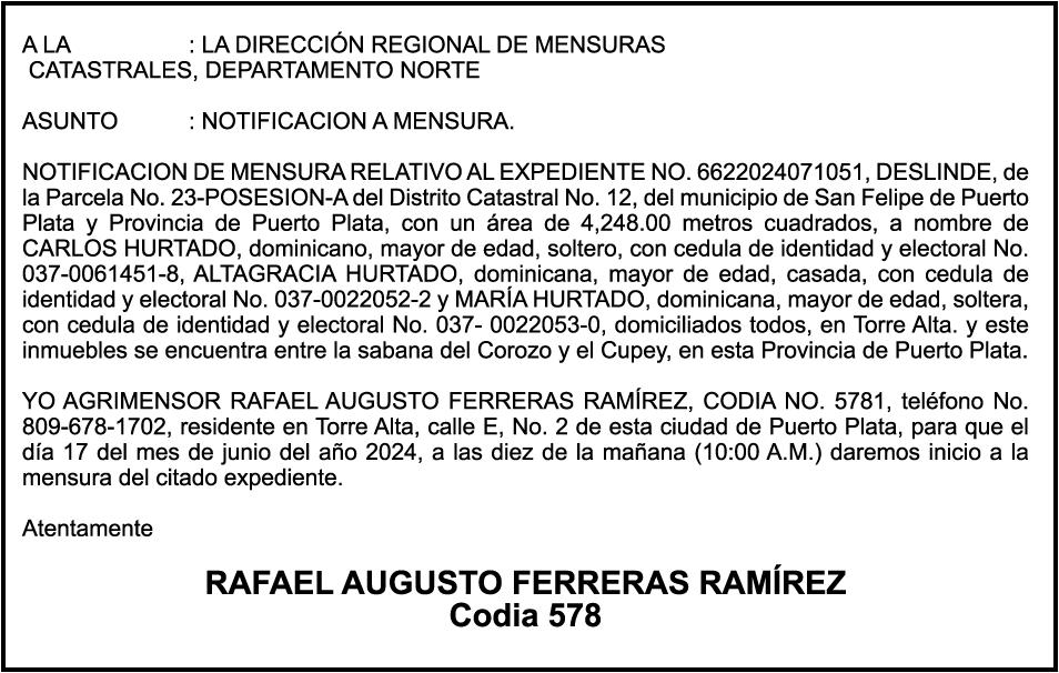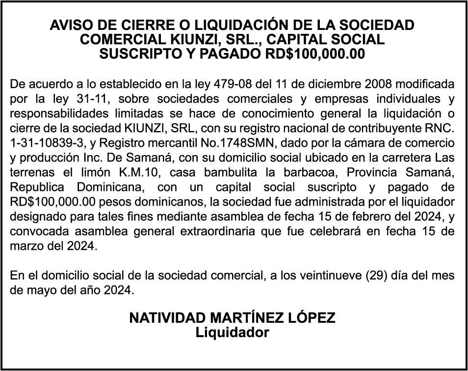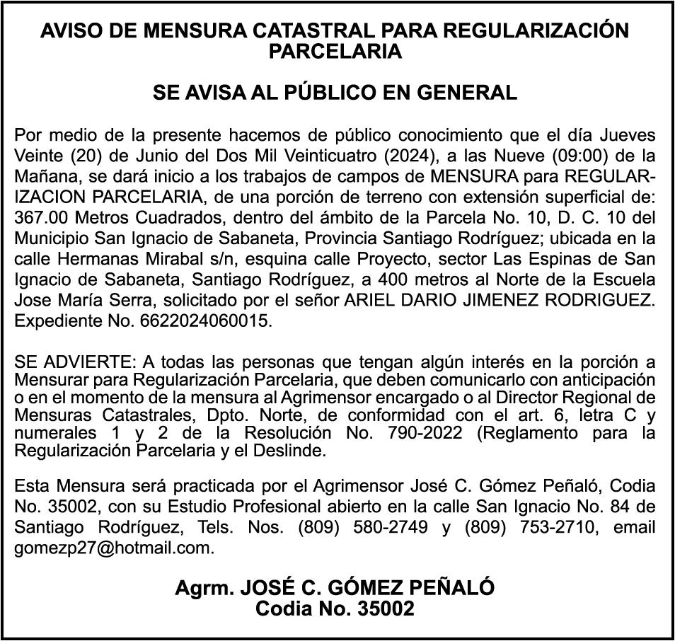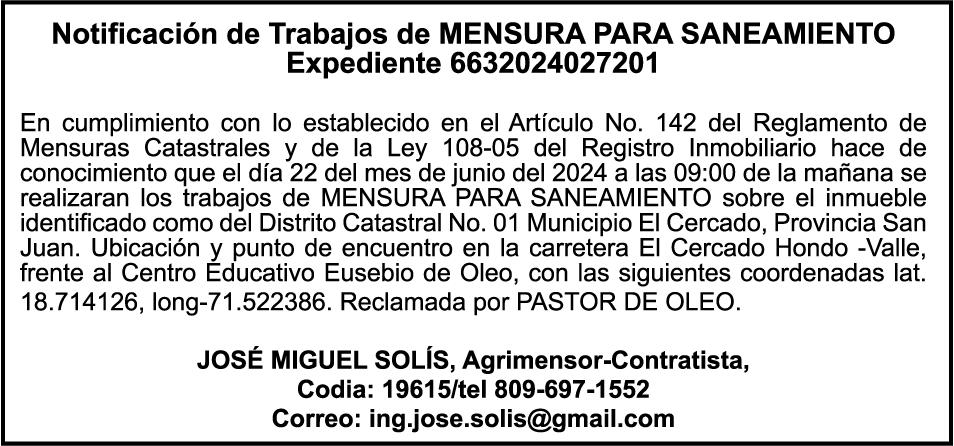 PERDIDA DE MATRICULA Automóvil Privado HONDA, Modelo ACCORD LX, Color gris, Año 1998, Placa A436659, Chasis 1HGCG5646WA084247, a nombre de LUIS ARELIS LUNA. AVISO: cambio de nombre de embarcación. Se hace de público conocimiento, que se le está cambiando el nombre a la lancha de recreo de nombre “SCAMMROK”, de 42.0 pies de eslora, matriculado en el puerto de Samaná, bajo el No. LP-S3-072BS, propiedad del señor SHAVANE DELANO TURQUEST , para que en lo adelante se haga figurar con el nombre de “CHAI BELLA”, en vez del primero.