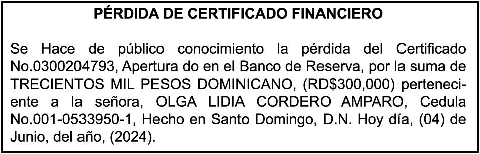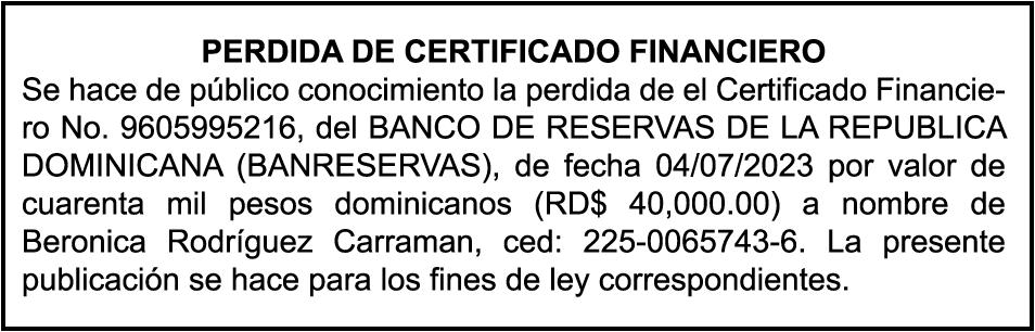 SE hace de público conocimiento las pérdidas de certificados de depósito número 769079682 emitido por Banco Popular Dominicano, S. A., a favor de MULING ALEJANDRA SANG BEN, portadora de la cedula de Identidad y Electoral no. 0010171105-9, certificado expedido en fecha 31 de agosto de 2011 Por el Monto (RD$900,000.00), más intereses generados a la fecha.