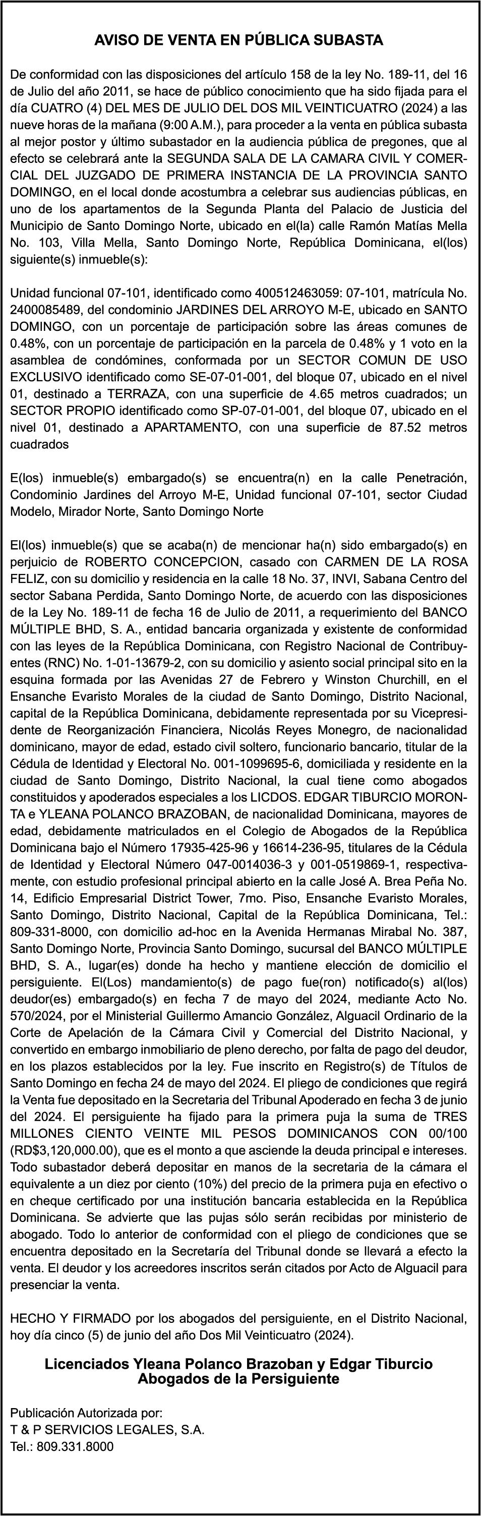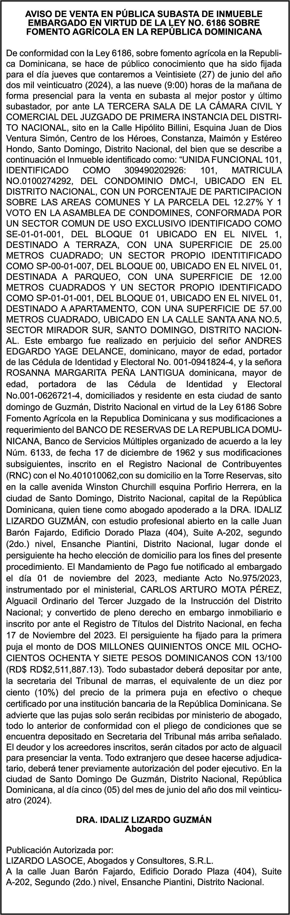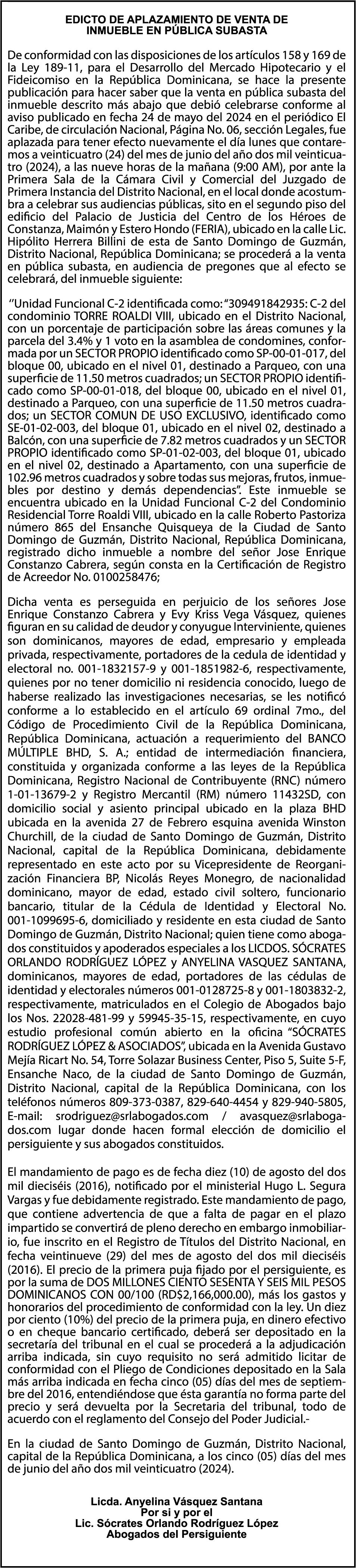 AURORA PEREZ BENITEZ, portadora de la Cédula de Identidad y Electoral 0930000477-8, certificado expedido en fecha 5 de enero de 2021 Por el Monto (RD$328,699.86), más intereses generados a la fecha.