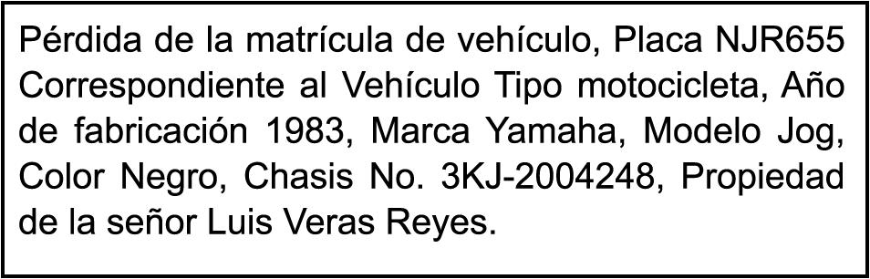 PERDIDA DE PLACA No. N690975 DE VEHICULO MOTOCICLETA, MARCA YAMAHA, MODELO JOG 50, AÑO 1994, COLOR GRIS, PLACA CHASIS NO. 3KJ7747071, MATRICULA NO.4361257, PROPIETARIA SRA. FRANCHESKA ILUMINADA TURBI BAUTISTA.