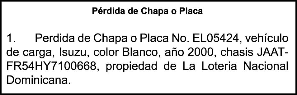 PERDIDA DE PLACA No. L362287, Veh. Carga OTTAWA, modelo 6BTA-59, Color blanco, Año 1989, Chasis 3063721189, a nombre de EMILIO JOSE DISLA SOTO.