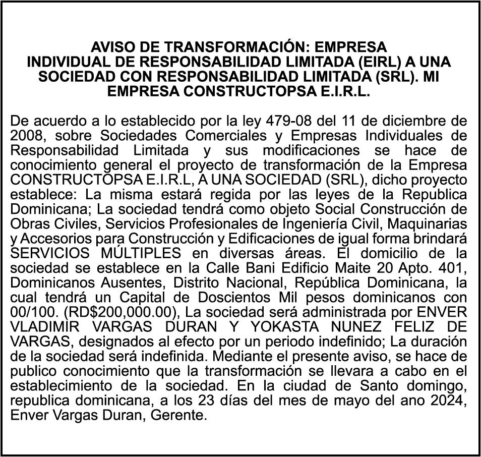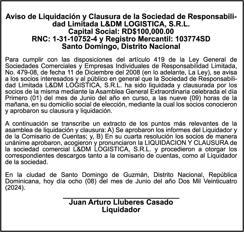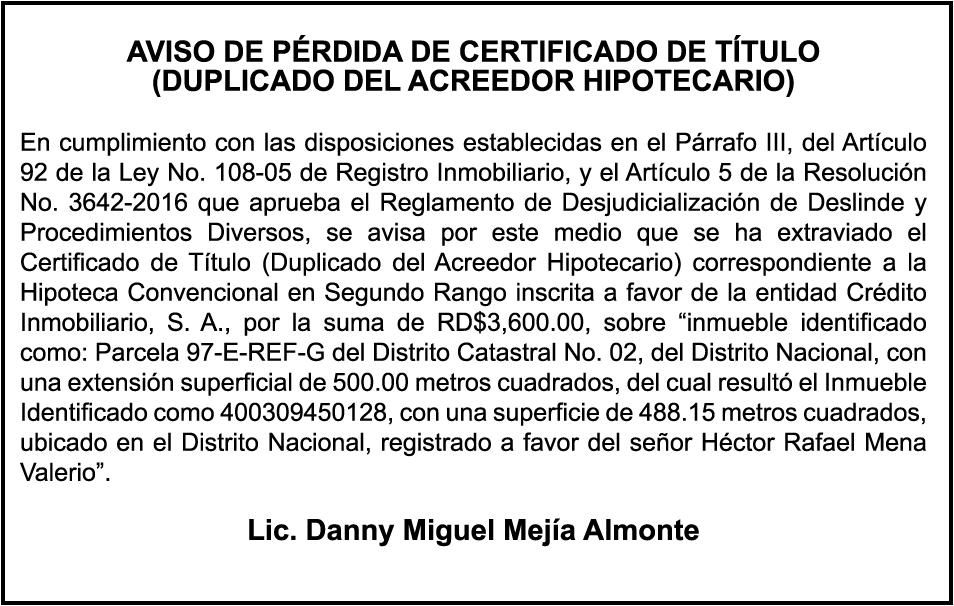 SE hace de público conocimiento las pérdidas de certificados de depósito número 824093157 emitido por Banco Popular Dominicano, S. A., a favor GRUPO INDUKERN DOMINICANA, SRL, sociedad debidamente constituida conforme a las leyes dominicana, con domicilio en esta ciudad de Santo Domingo, prevista del RNC 1-31-08831-7, certificado expedido en fecha 27 de septiembre de 2021 Por el Monto (RD$2,196,679.32), más intereses generados a la fecha.