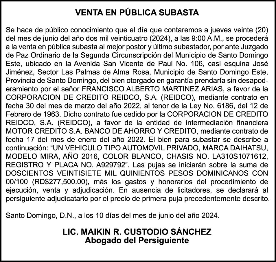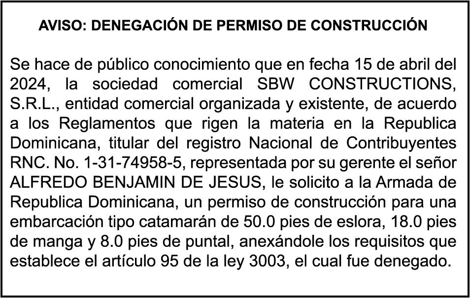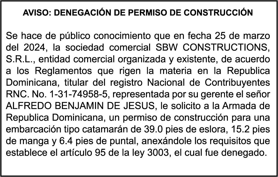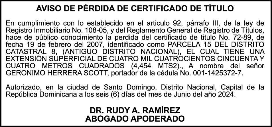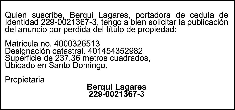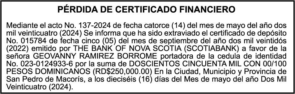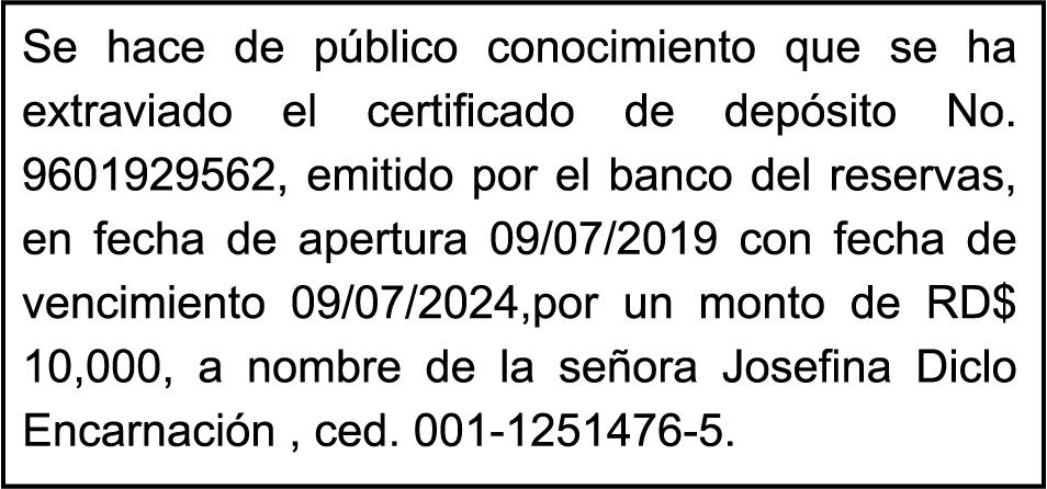 SE hace de público conocimiento las pérdidas de certificados de depósito número 832447320 emitido por Banco Popular Dominicano, S. A., a favor CARLOS ISAAC SUAREZ portador de la Cédula de Identidad y Electoral número 402-0953729-5, certificado expedido en fecha 23 de febrero de 2023 Por el Monto (RD$271,924.54), más intereses generados a la fecha.