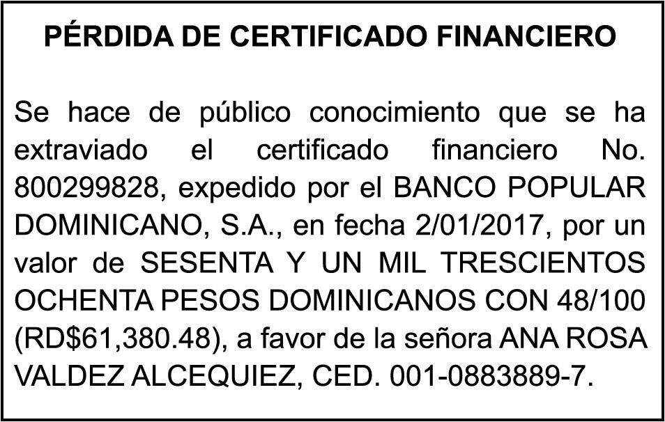 SE hace de público conocimiento las pérdidas de certificados de depósito número 778374074 emitido por Banco Popular Dominicano, S. A., a favor de ANA GISELA MARTINEZ POLANCO, portadora de la cedula de Identidad y Electoral no. 072-0007600-3, certificado expedido en fecha 14 de enero de 2013 Por el Monto (RD$441,694.66), más intereses generados a la fecha.