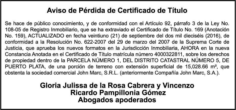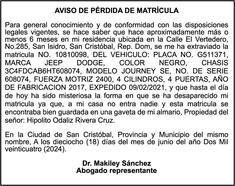 PERDIDA DE PLACA No. A770325, Automóvil Privado HONDA, modelo ACCORD LX, Color gris, Año 2013, Chasis 1H G CR2 F 39D A 074731 , a nombre de STEVEN DEYVIN F R A NC O JAVIE R SE hace de público conocimiento las pérdidas de certificados de depósito número 724068051 emitido por Banco Popular Dominicano, S. A., a favor JOSE MIGUEL DOMINGUEZ SANTANA, portador de la Cédula de Identidad y Electoral núm e ro 0 2 7-000 3 598-9 certificado expedido en fecha 4 de abril de 2005 por el Monto (RD$16,070.68), más intereses generados a la fecha.