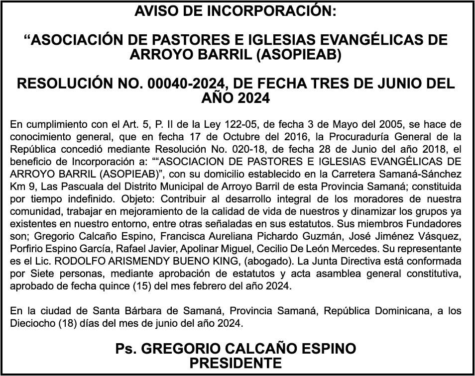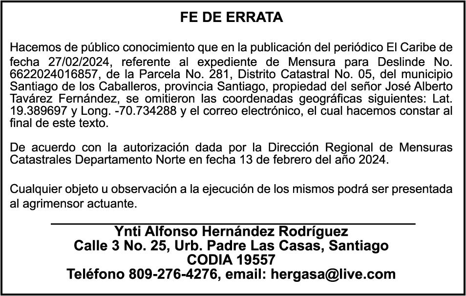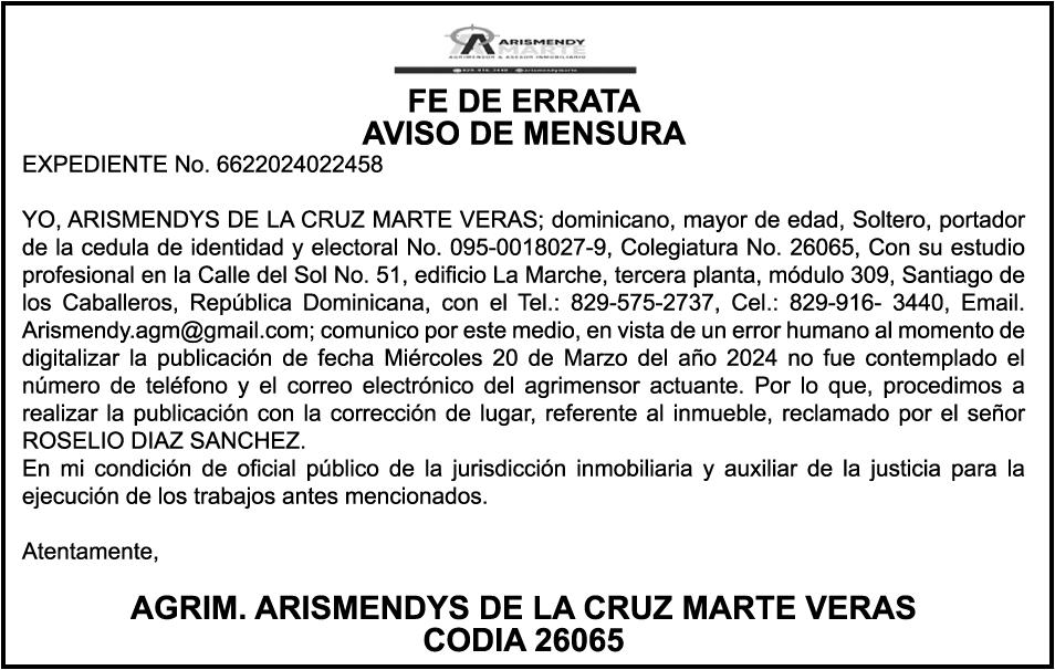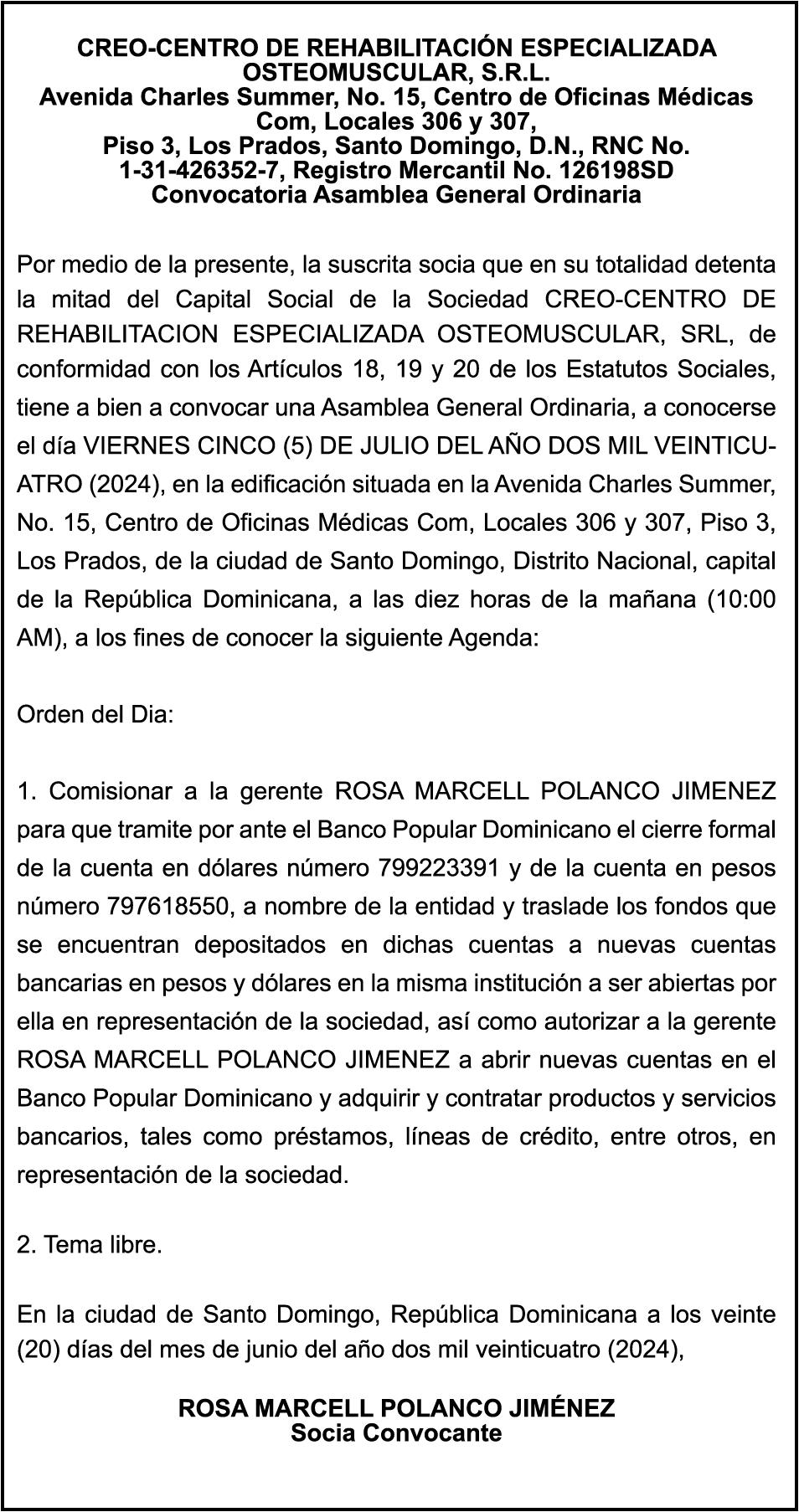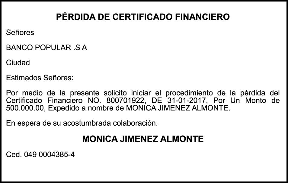 SE hace de público conocimiento las pérdidas de certificados de depósito número 820932853 emitido por Banco Popular Dominicano, S. A., a favor R OSSVE L S M A NU E L C A LD E R O N G U E RR E R O portador de la Cédula de Identidad y Electoral número 003-0060313-1 cer t i f i c ad o expedido en fecha 2 de marzo de 2021 por el Monto (RD$10,693.78), más intereses generados a la fecha.