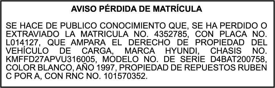 PERDIDA DE MATRICULA: Del JEEP, Placa G121790, Chasis 5N1ED28Y03C702060 Marca NISSAN, Modelo XTERRA, Color BLANCO, AñO 2003,a nombre de OMAR MIGUEL BATISTA VASQUEZ, Ced. 40234909709