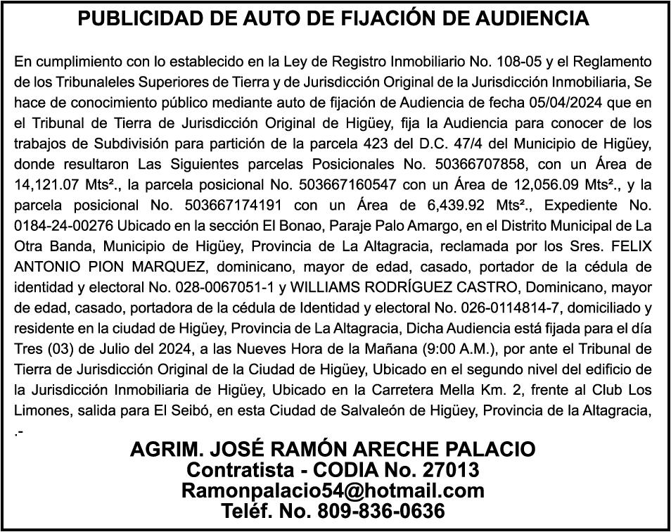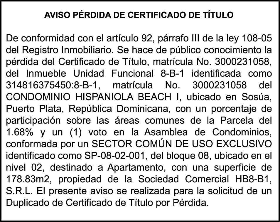 PERDIDA de Certificado de propiedad, a nombre de BLAS GIL REYES cedula no. 26316-28, de una porción de terreno de 355 tareas, dentro del DC 47 segunda, parcela 206-P, municipio de Higuey, Uvero A l t o