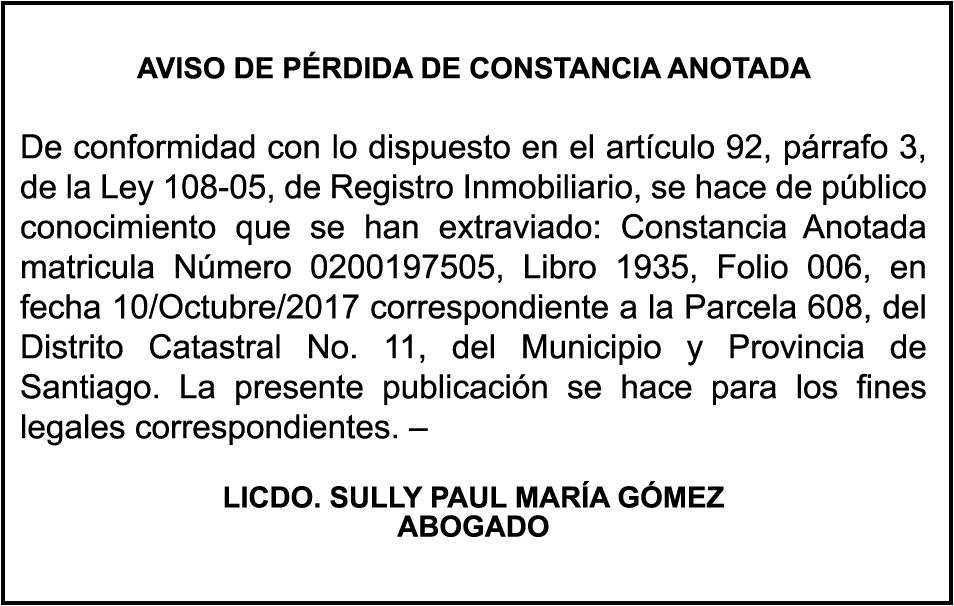 SE hace de público conocimiento la pérdida del certificado financiero número 826554966 emitido por Banco Popular Dominicano, S. A., a favor DILIA MARGARITA LLUBERES RORIGUEZ, portadora de la Cédula de Identidad y Electoral número 001-1717940-8, certificado expedido en fecha 2 de marzo de 2022 por el Monto (US$3,064.21), mas intereses generados a la fecha.