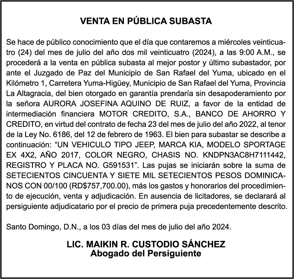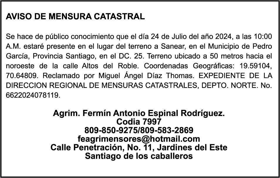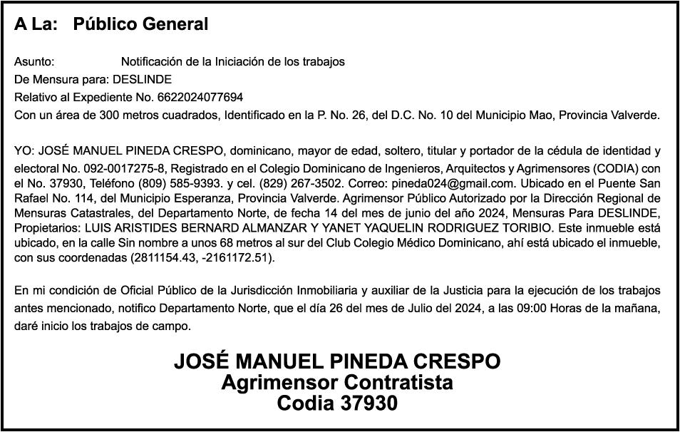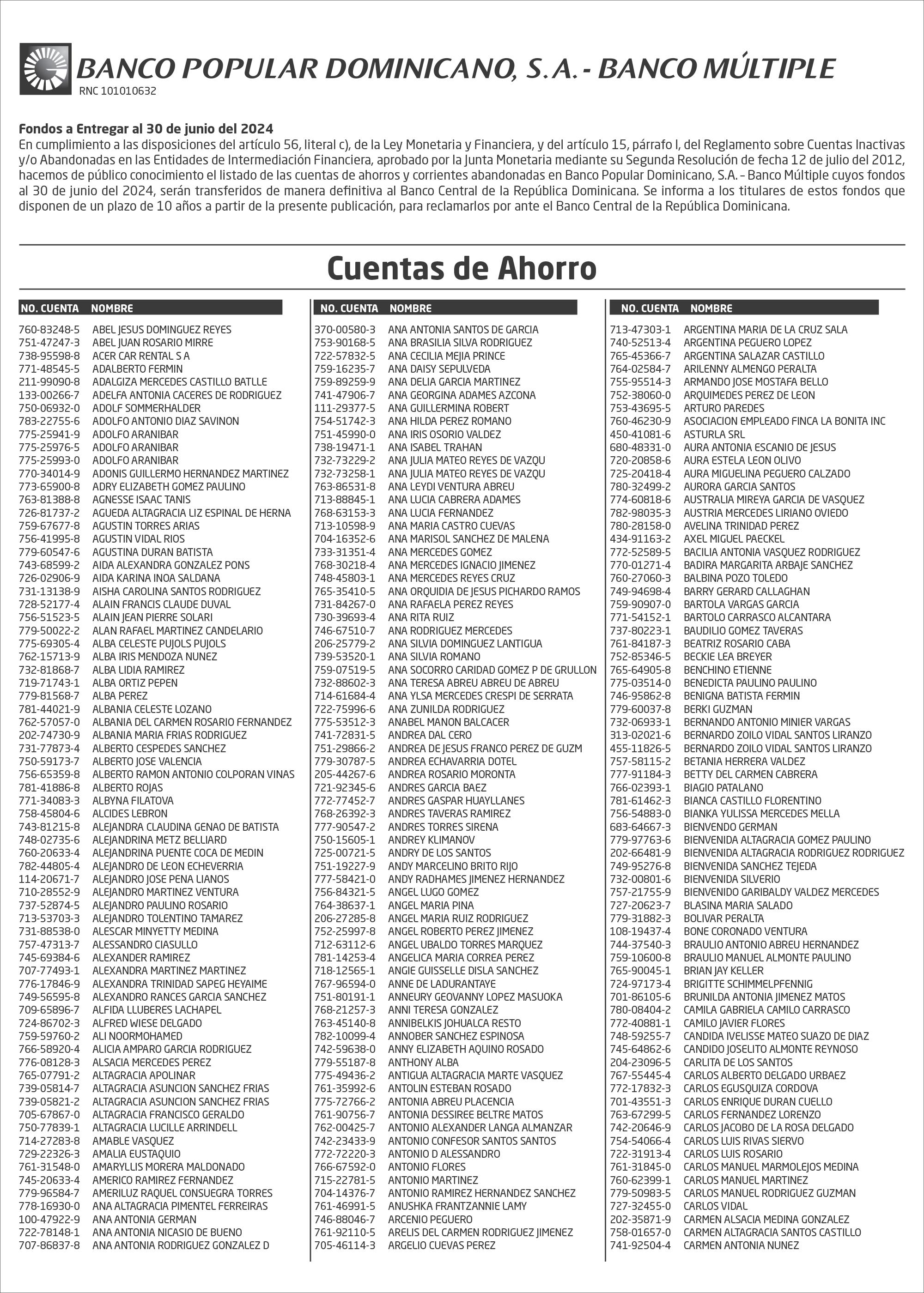SE hace de público conocimiento la pérdida del certificado financiero número 840366454 emitido por Banco Popular Dominicano, S. A., a favor HEIDY VANESSA BENZAN HERRERA DE HOLGUIN, portador de la Cédula de Identidad y Electoral número 012-0077583-9, certificado expedido en fecha 1 de abril de 2024 por el Monto (RD$50,000.00), mas intereses generados a la fecha.