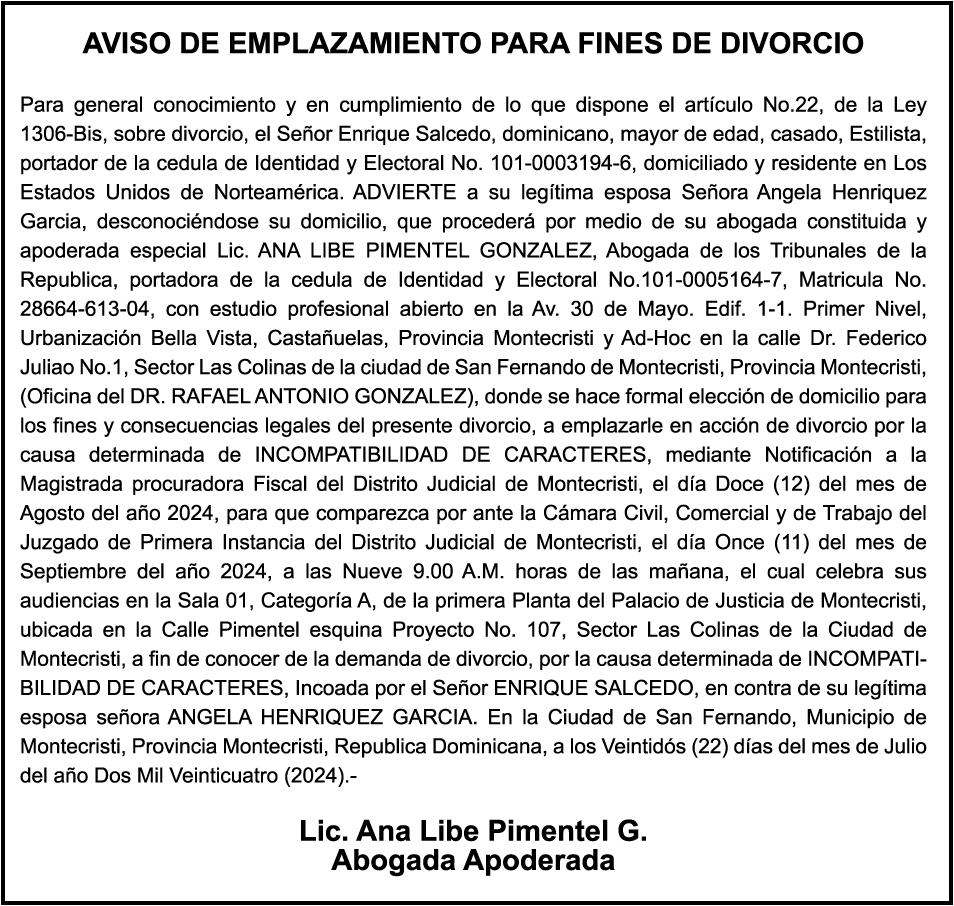 AVISO:CESION DE DERECHO DE EMBARCACION La Señora. KATTY GEORGINA VALDEZ LIRIANO, MEDIANTE ACTO DE CESION DE DERECHO, CEDE SU CINCUENTA (50%) POR CIENTO QUE TIENE SOBRE LOS DERECHOS DE PROIEDAD DEL CATAMARAN DE RECREO DE NOMBRE “BLUE PACIFIC”, MATRICULA. NO. CR-B742617SBS, DE 45.0 PIES DE ESLORA, COLOR BLANCO Y AZUL, al Sr. ELVYN RAMON OVALLES OLEA, cedula No. 001-1158552-7, COMO PROPIETARIO UNICO.