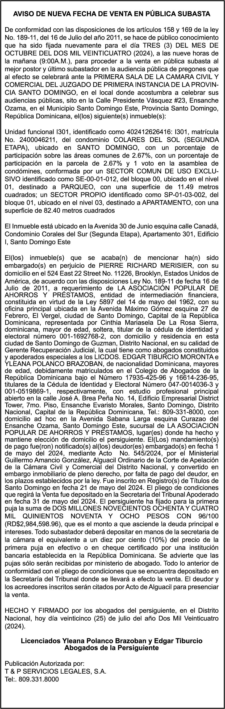 Automovil Privado TOYOTA, Modelo CORROLLA CE, Color GRIS, Año 1988, Placa A034404, Chasis 1NXAE8263JZ520488, a nombre de ADIL DEL ROSARIO LOPEZ ALMANZAR. SE hace de público conocimiento la pérdida del certificado financiero número 840359830 emitido por Banco Popular Dominicano, S. A., a favor RAFAEL RODRIGUEZ SANTIAGO, pasaporte no. 557383345, certificado expedido en fecha 1 de abril de 2024 por el Monto (US$10,080.98), mas intereses generados a la fecha.