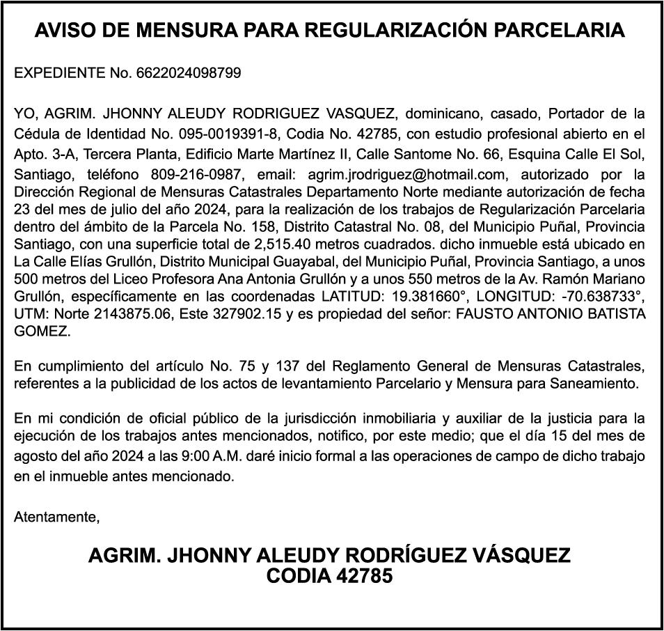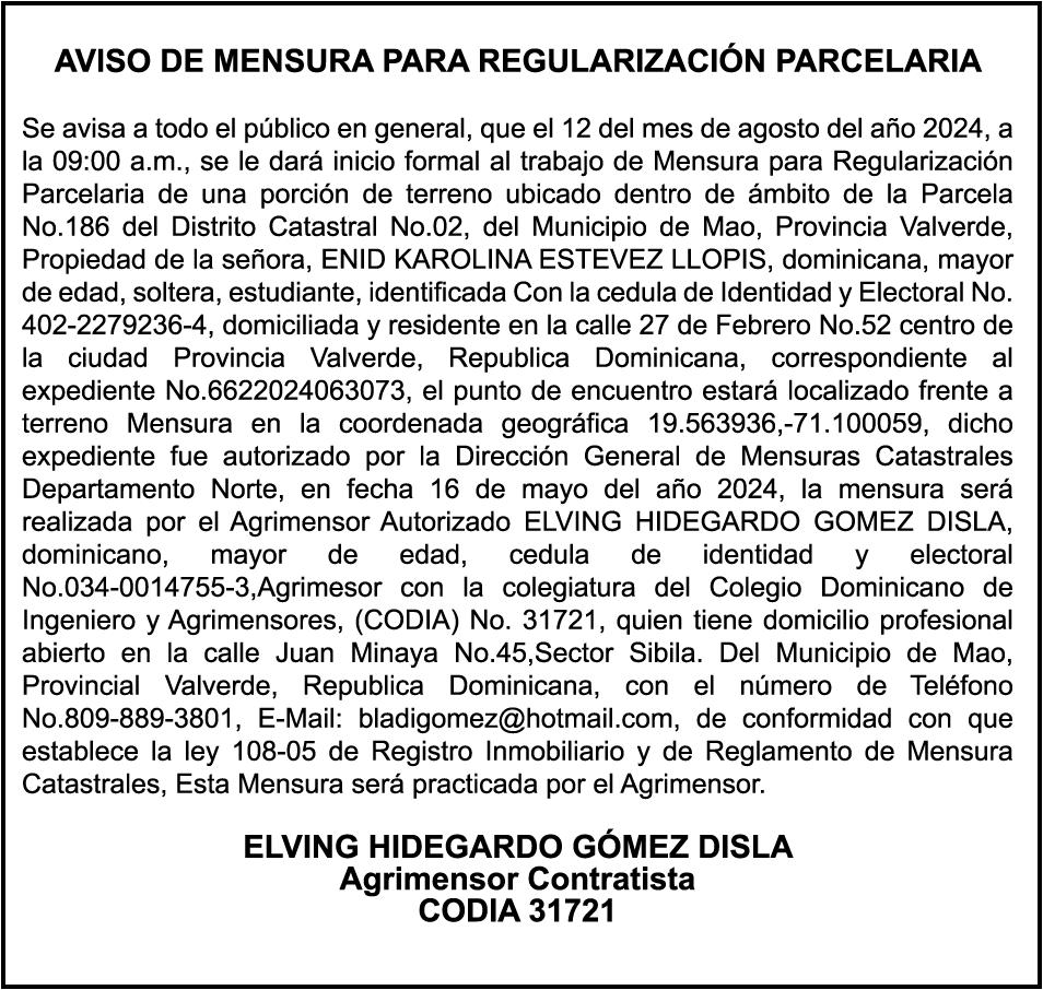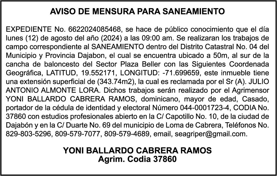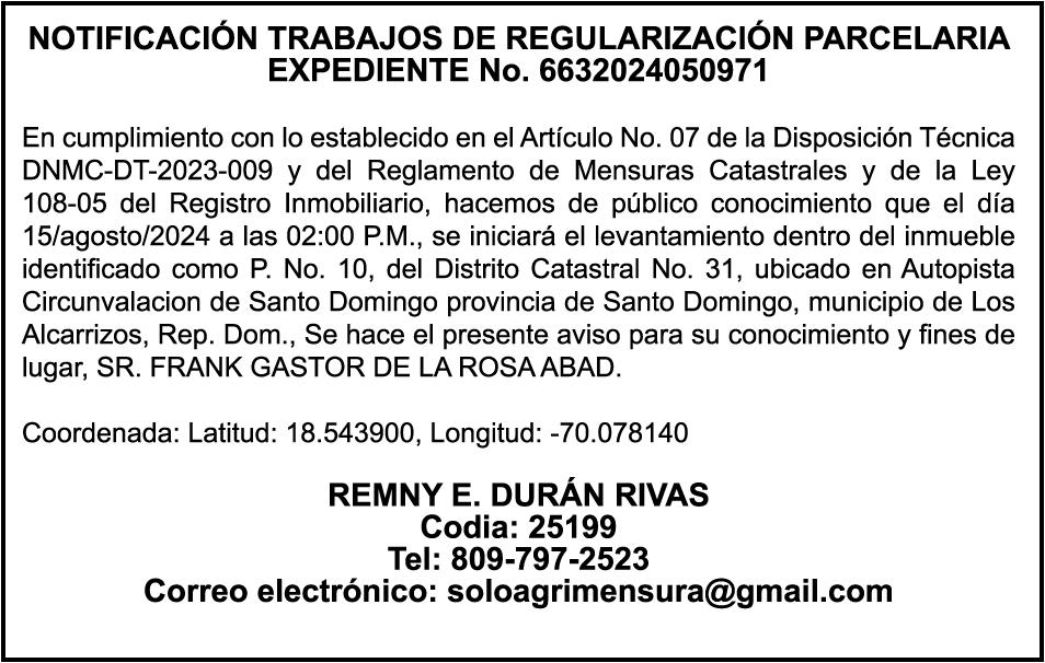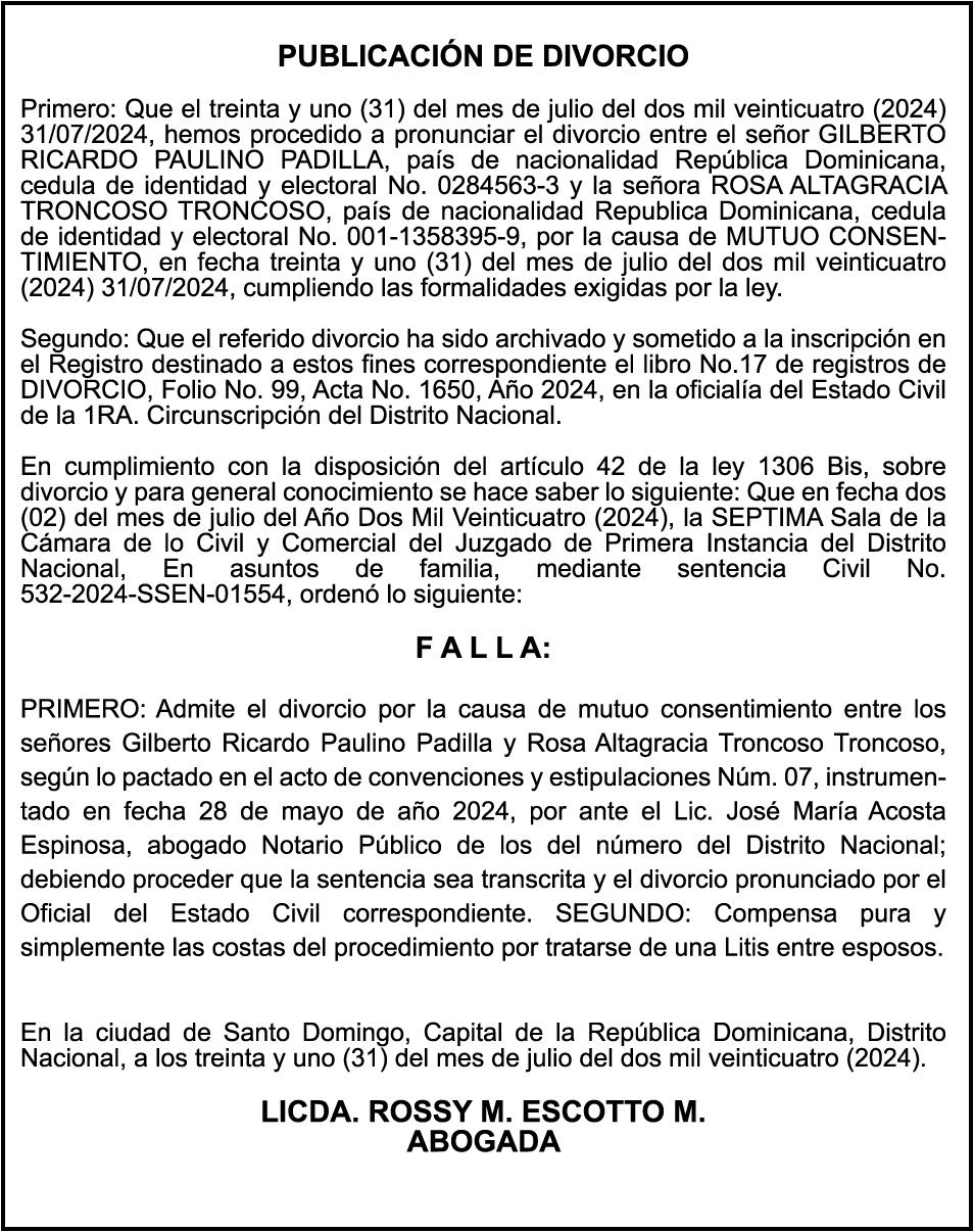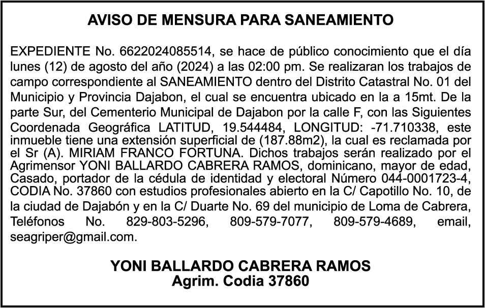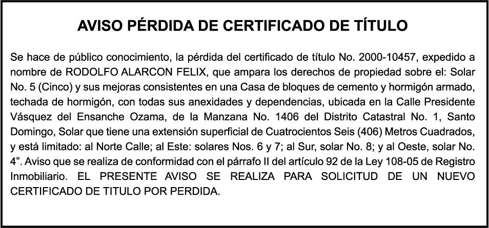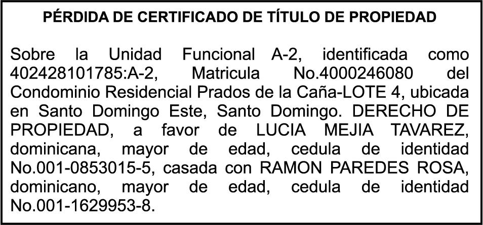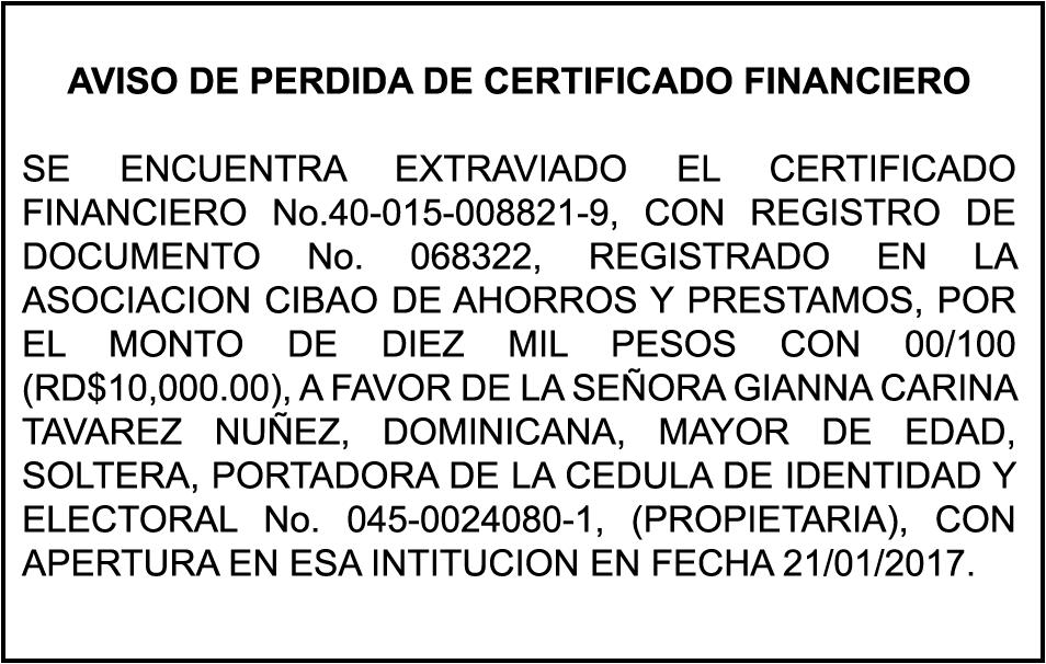 SE HACE de público conocimiento la pérdida del certificado financiero número 838456440 emitido por Banco Popular Dominicano, S. A., a favor BLADIMIR RIJO FIGUEROA, Portador de Cedula de Identidad y Electoral no. 402-1996063-6, certificado expedido en fecha 8 de enero de 2024 por el Monto (RD$41,048.67), mas intereses generados a la fecha.