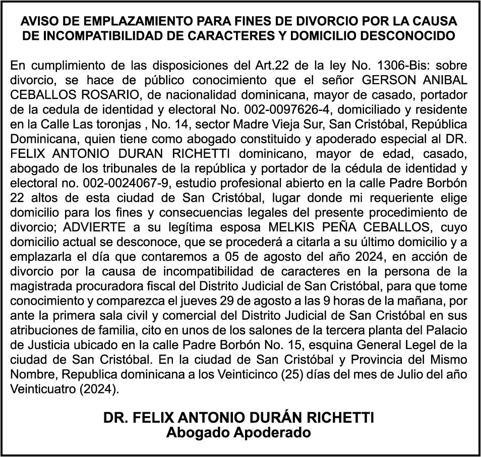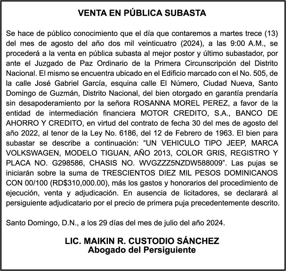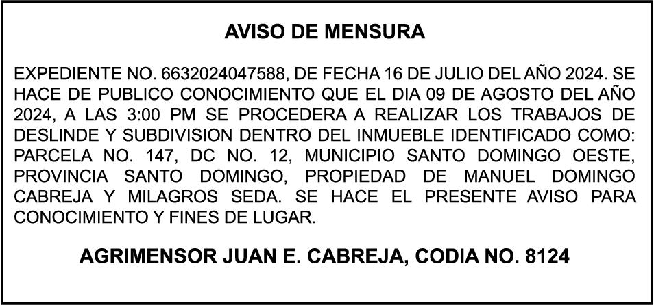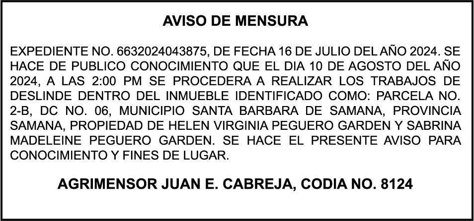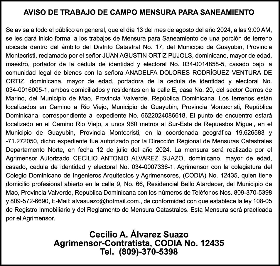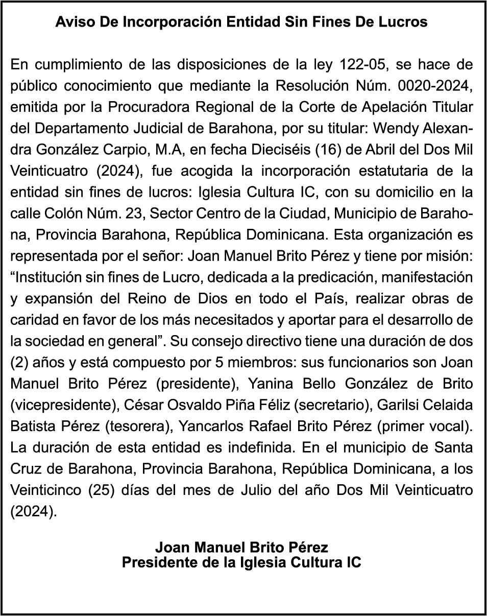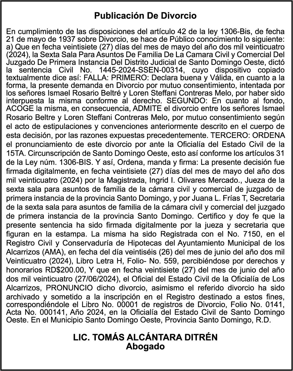 SE HACE de público conocimiento la pérdida del certificado financiero número 838456440 emitido por Banco Popular Dominicano, S. A., a favor BLADIMIR RIJO FIGUEROA, Portador de Cedula de Identidad y Electoral no. 402-1996063-6, certificado expedido en fecha 8 de enero de 2024 por el Monto (RD$41,048.67), mas intereses generados a la fecha.