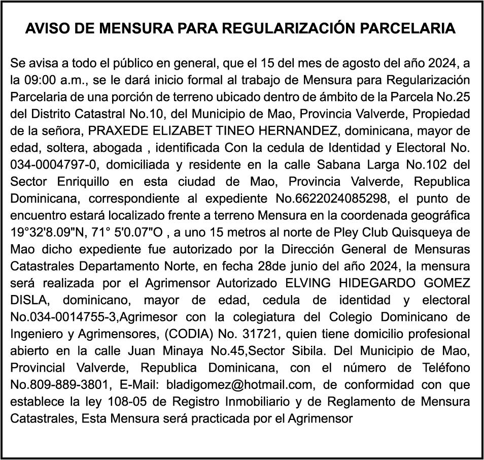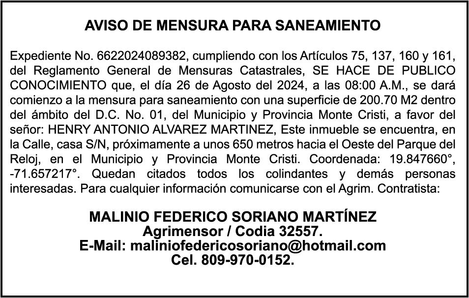 AVISO PERDIDA DE PLACA: Se hace de público conocimiento, la pérdida de la placa No.N449902 , de la motocicleta marca honda color verde, modelo C90, chasis No. HA022035250, propiedad del Sr. Héctor Darío García Lemos, cedula 010-0066674-1